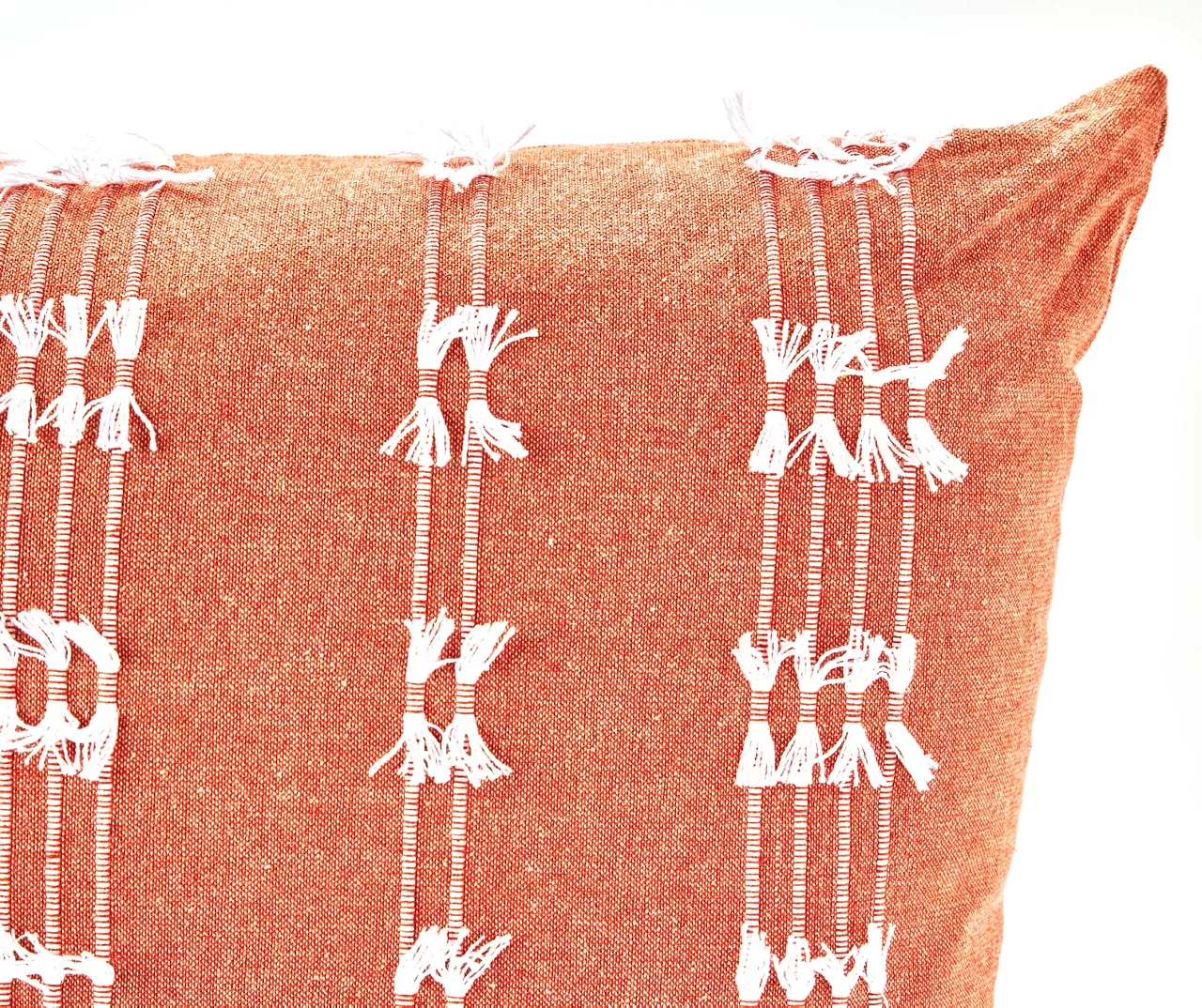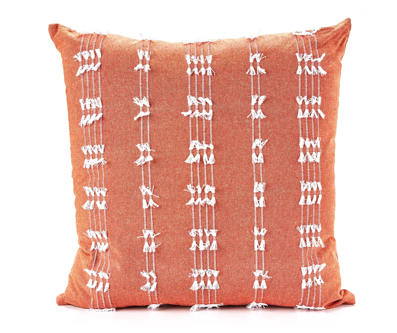 Toss a touch of playful boho style in a living room or bedroom with this square throw pillow. The warm coral cotton fabric features white stripes on the front adorned with small tassels for textured charm.