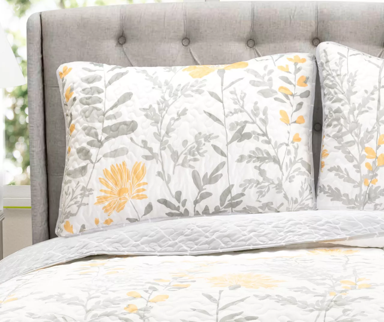 Soft gray and yellow blossoms bring botanical elegance to this quilt set that features swirling quilting crafted from soft polyester to keep you cozy through the night.