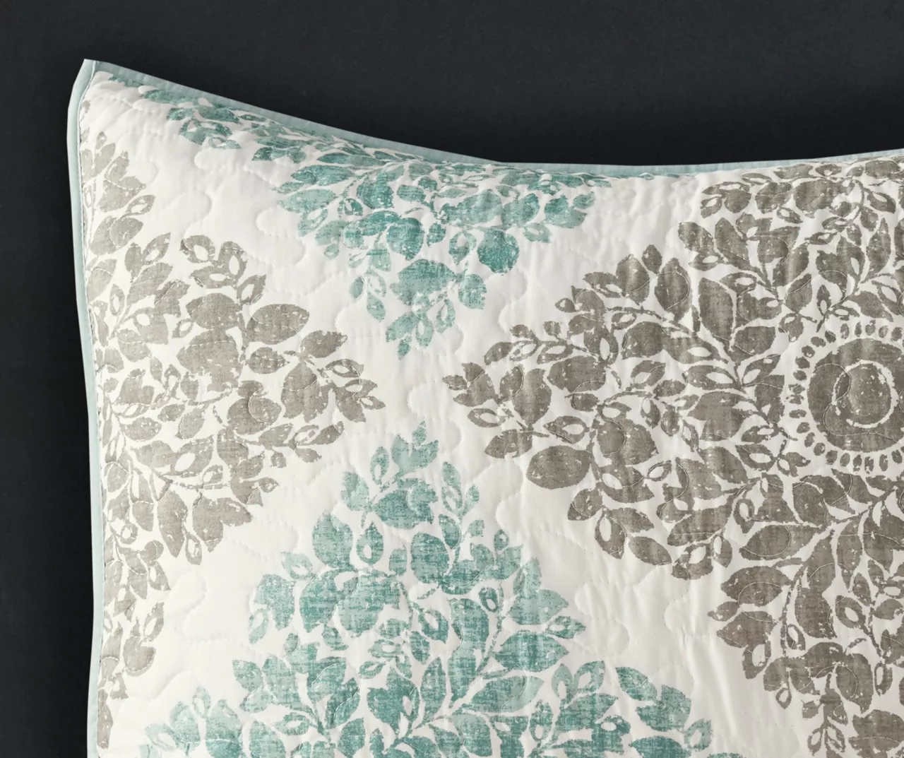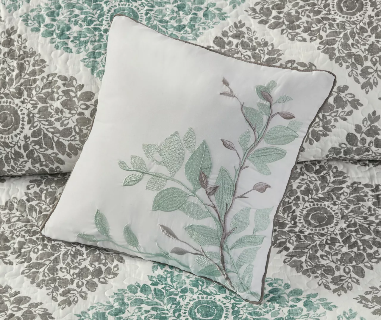Spruce up your space with this six-piece reversible coverlet set. The unique pattern has a small leaf print inside each diamond that makes up this crisscross design. Pops of dusty aqua give the perfect amount of color to your space. Three decorative pillows use embroidery and fabric manipulation for the perfect finishing touches.