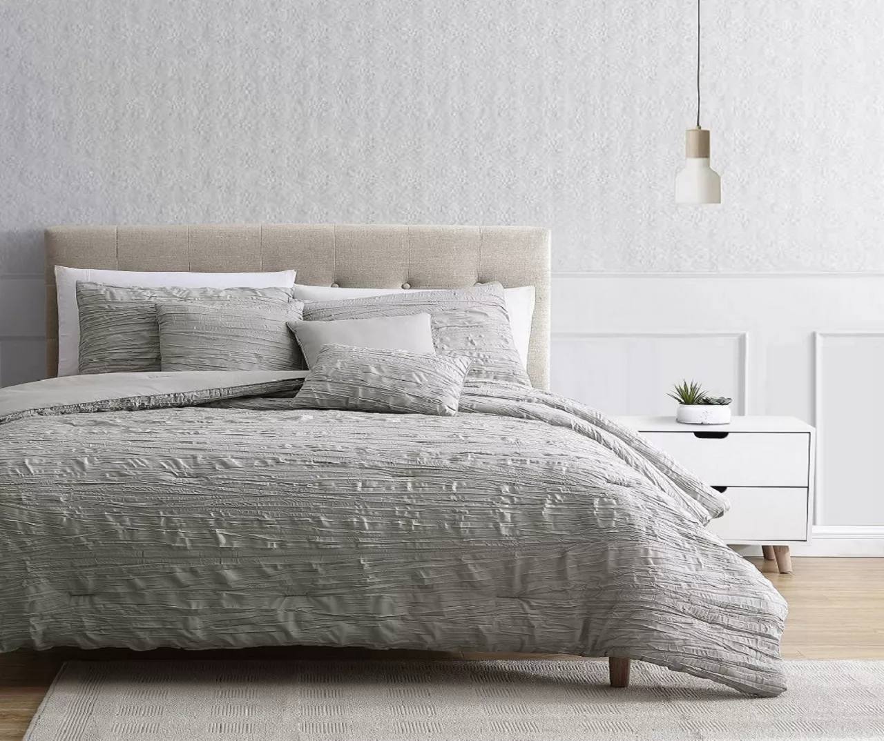 Create a sleep space of relaxation and comfort with this lovely Birch comforter set that features a crinkled texture and a neutral solid hue that adds casual charm to a guest or master bedroom. Complementary square decorative pillows complete the look for an all-in-one bedroom refresh.