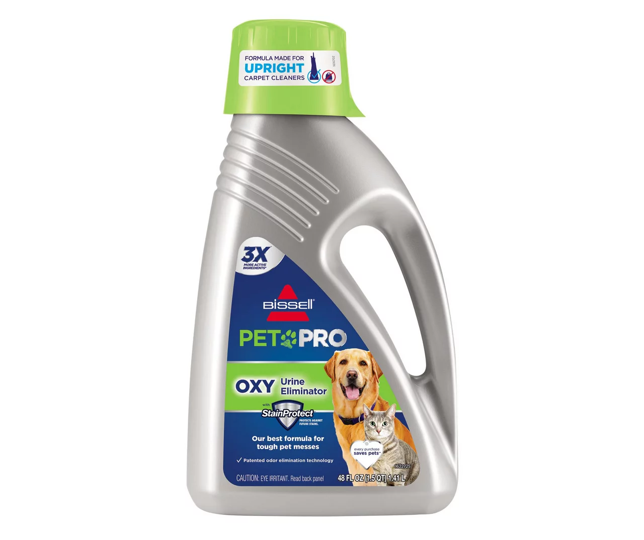 Bissell Pet Pro Oxy Urine Eliminator formula works in all our Bissell upright carpet cleaners to remove tough pet stains and odors like urine. It discourages pets from going in the same spot again, too. This formula is safe on carpet, upholstery, area rugs and similar soft surfaces. It’s also safe for use around kids and pets when it’s used as directed.