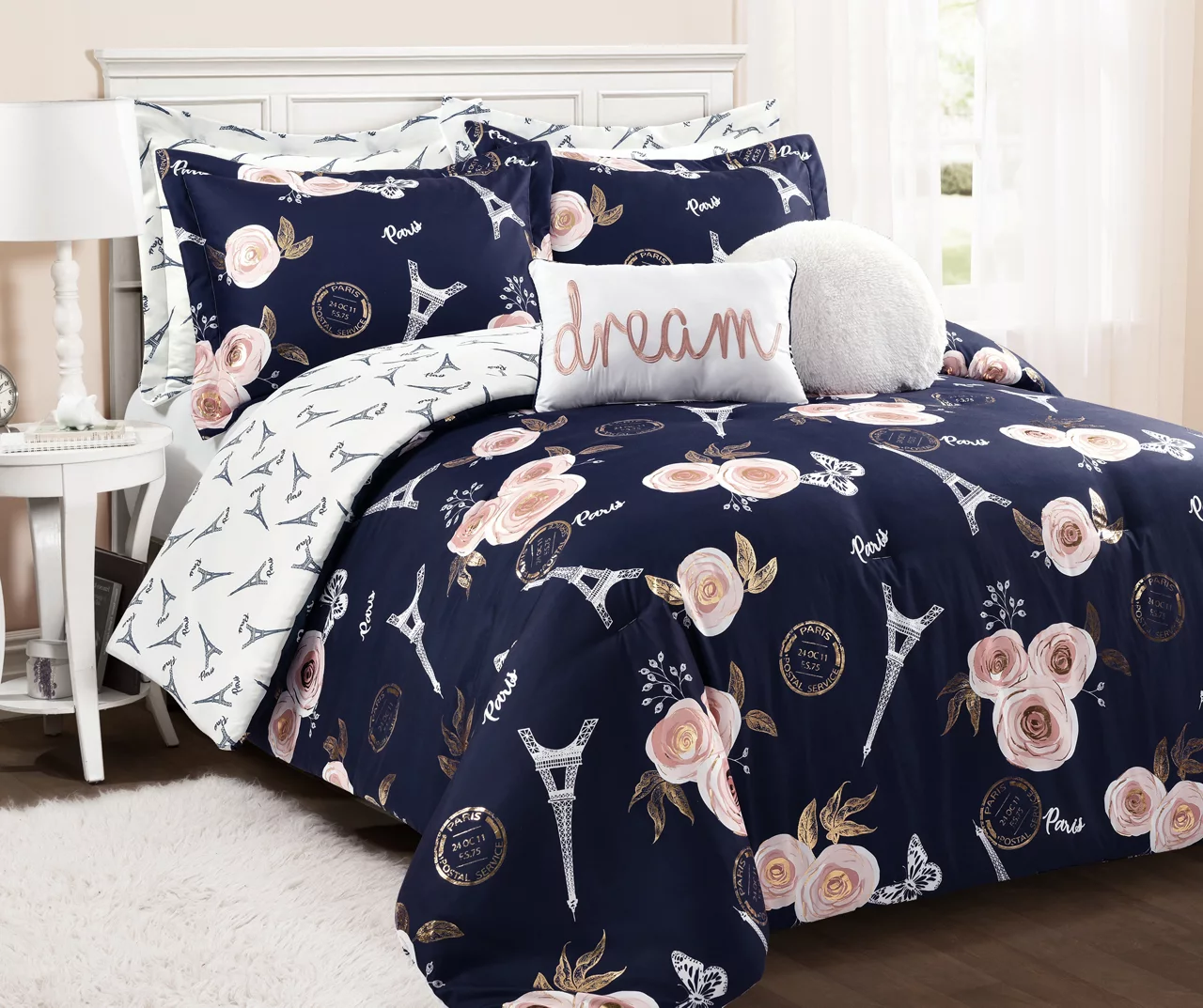 - Contrast Eiffel tower print in white on the euro sham and reverse side of the comforter