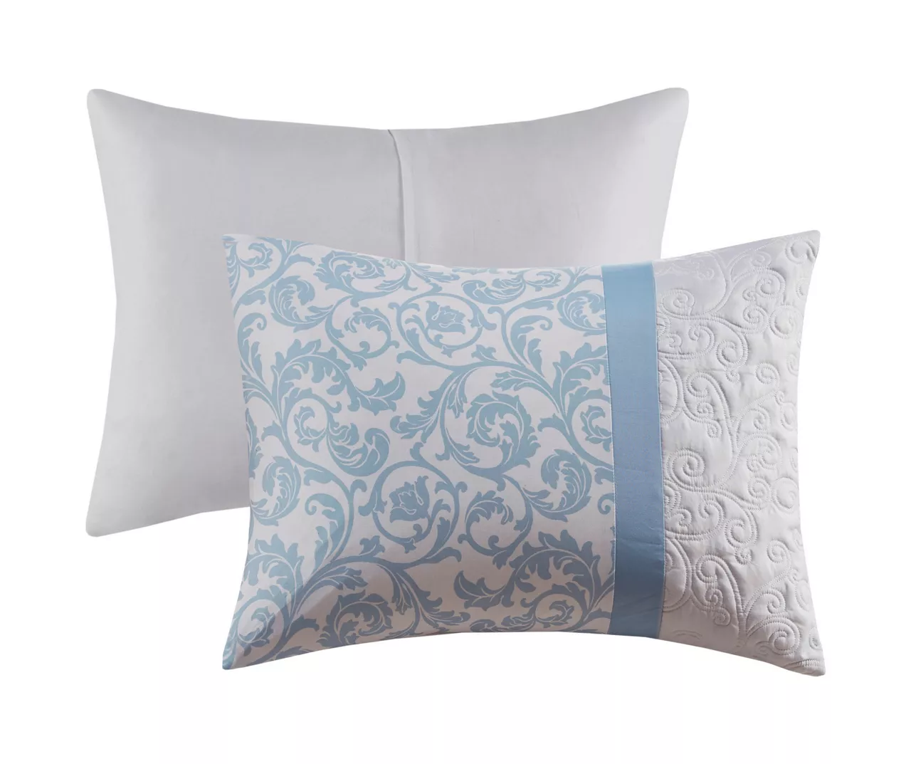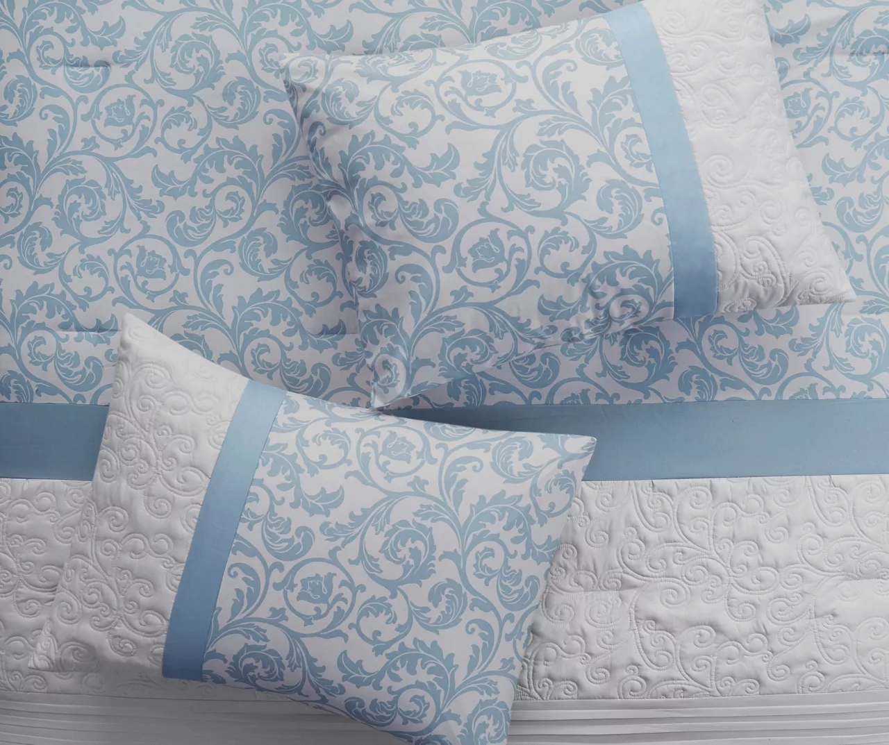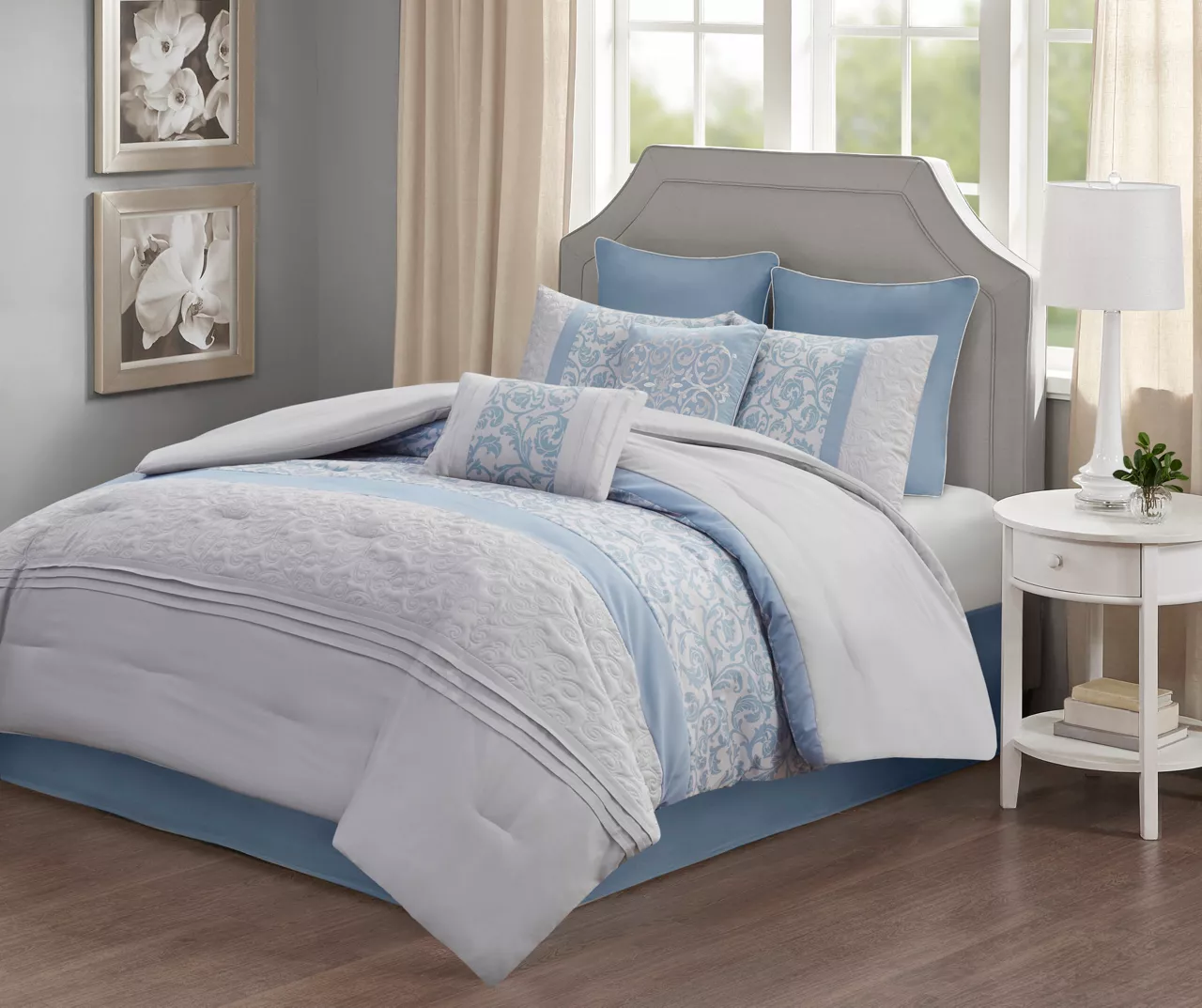 - Includes comforter, bed skirt, 2 standard shams, 2 euro shams and 2 decorative pillows