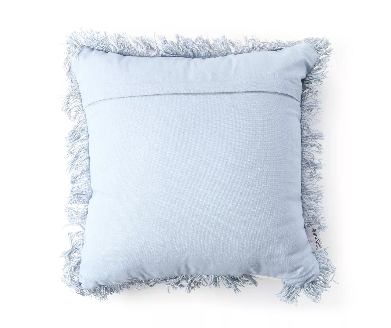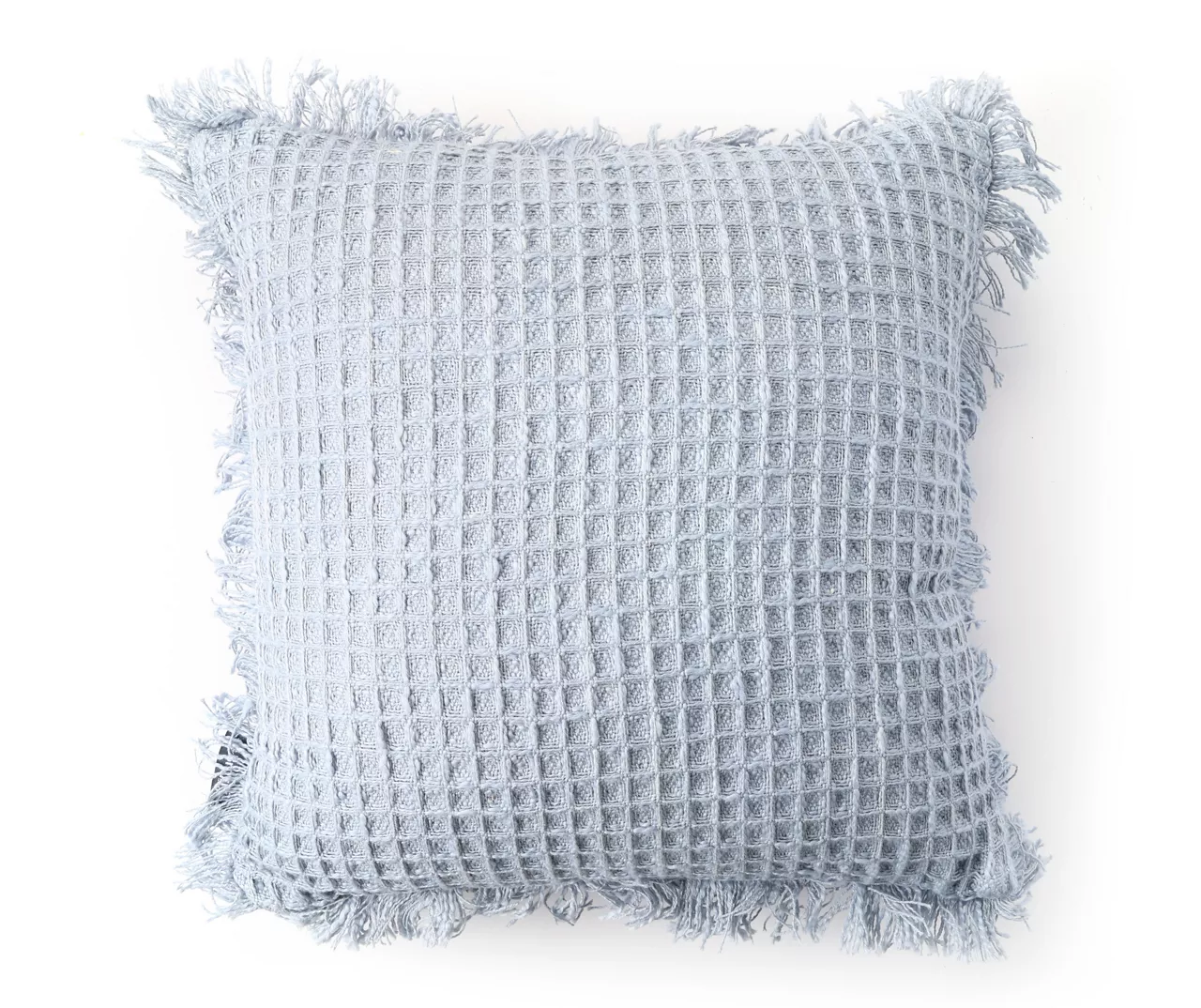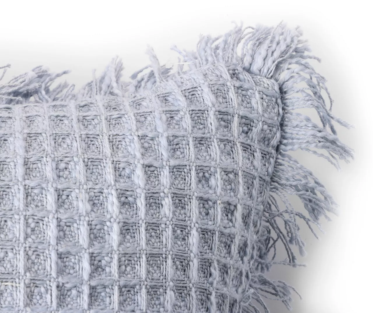With a waffle-knit face, fringed edging and cotton fabric construction in a pale blue hue, this plush throw pillow brings textured charm and modern elegance to any sofa, bed or accent chair it graces.