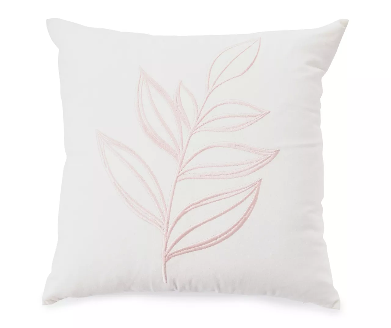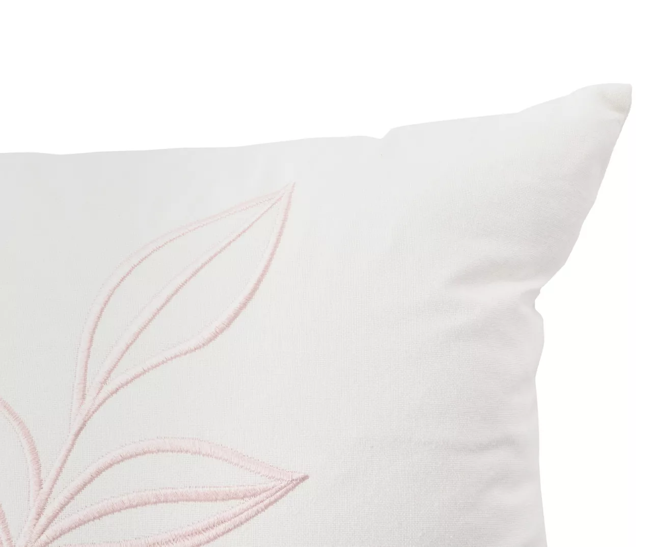 Decorated with a simple stem design in soft rose pink embroidery on off-white cotton fabric, this plush throw pillow adds sweet botanical elegance and soft comfort to your living or bedroom space.