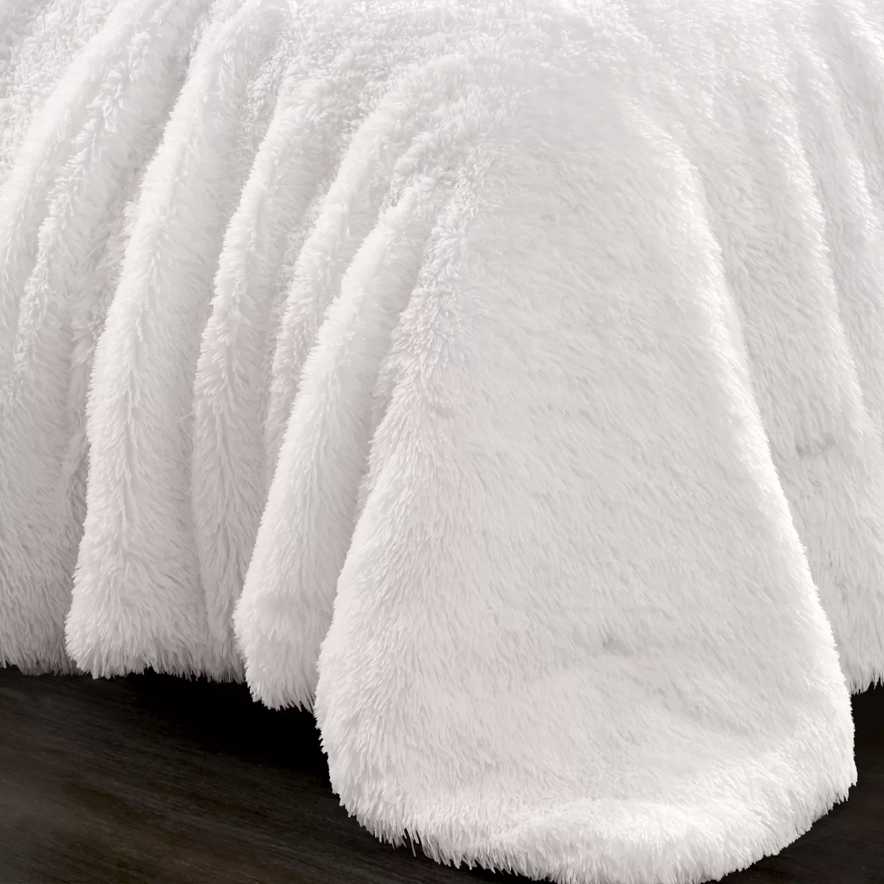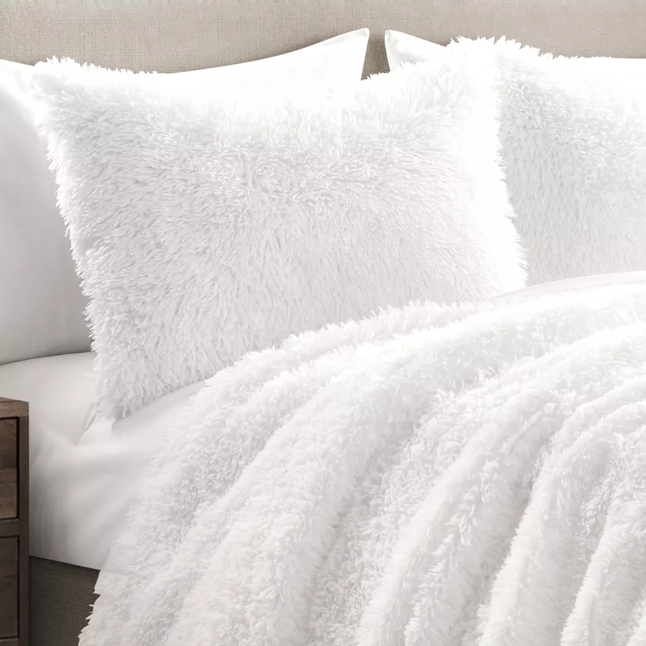 When the nights are cool, cozy up in the plush faux fur fabric of this soft comforter set crafted in a solid white hue that effortlessly blends with your existing décor and furniture.