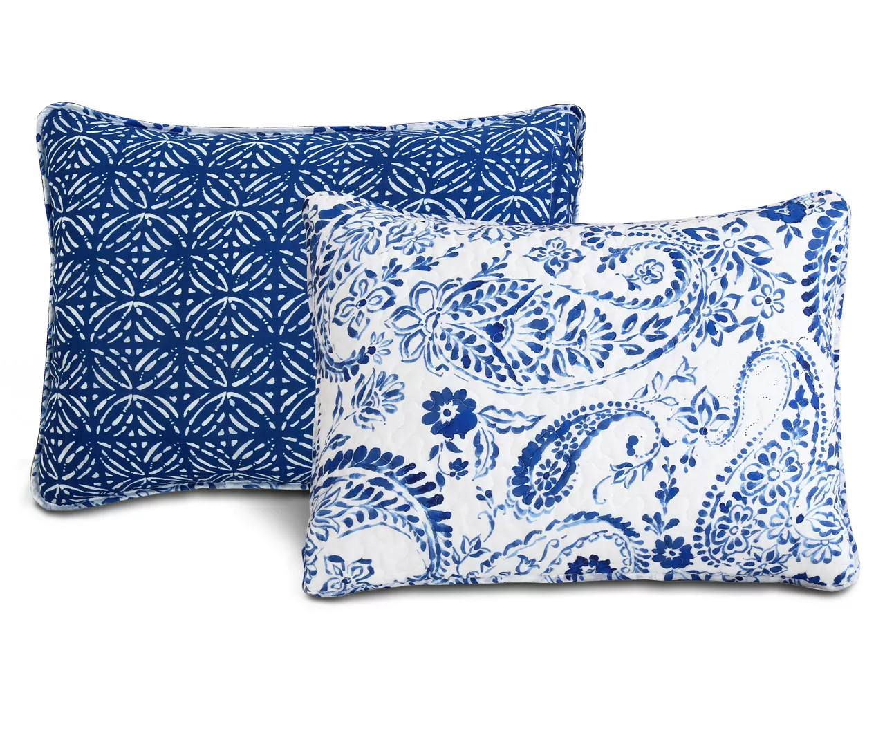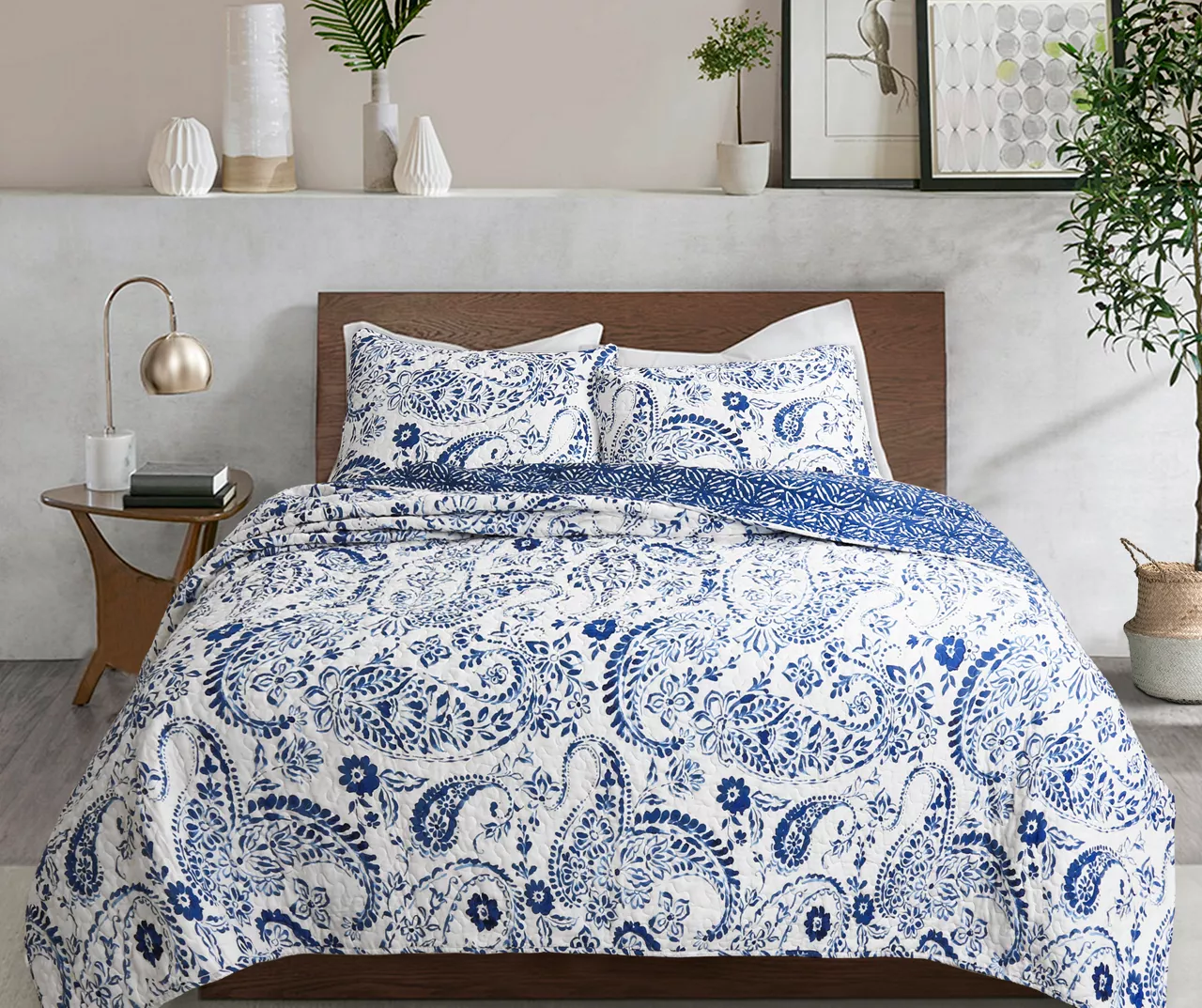 An elegant floral and paisley print in deep blue and crisp white hues brings a touch of garden elegance to your sleep space, while the breathable cotton construction keeps you cozy and comfy through the night. The quilt reverses to a floral grid contrast pattern so you can switch up your bedroom style on a whim.