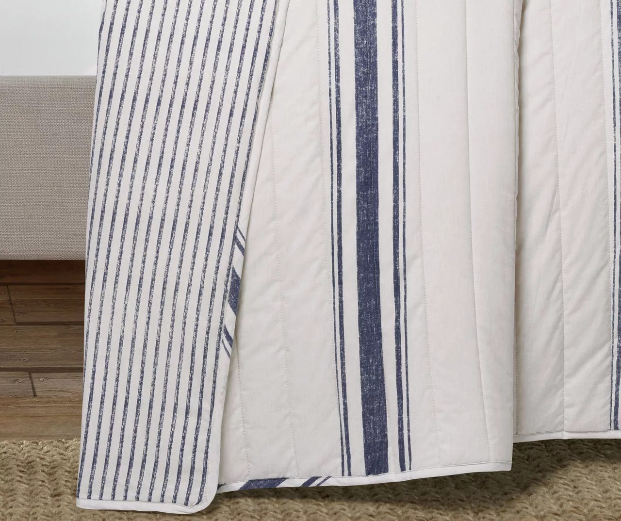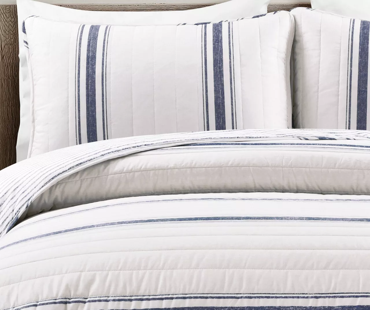 Crisp navy stripes define this white bedding set from Lush Decor with classic farmhouse appeal, and horizontal quilting finishes the look with textured charm. Matching shams complete the look, and the back side features tight navy stripes so you can switch up your bedroom style on a whim.