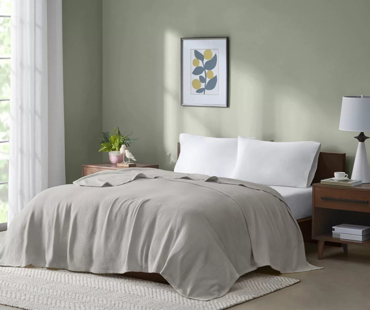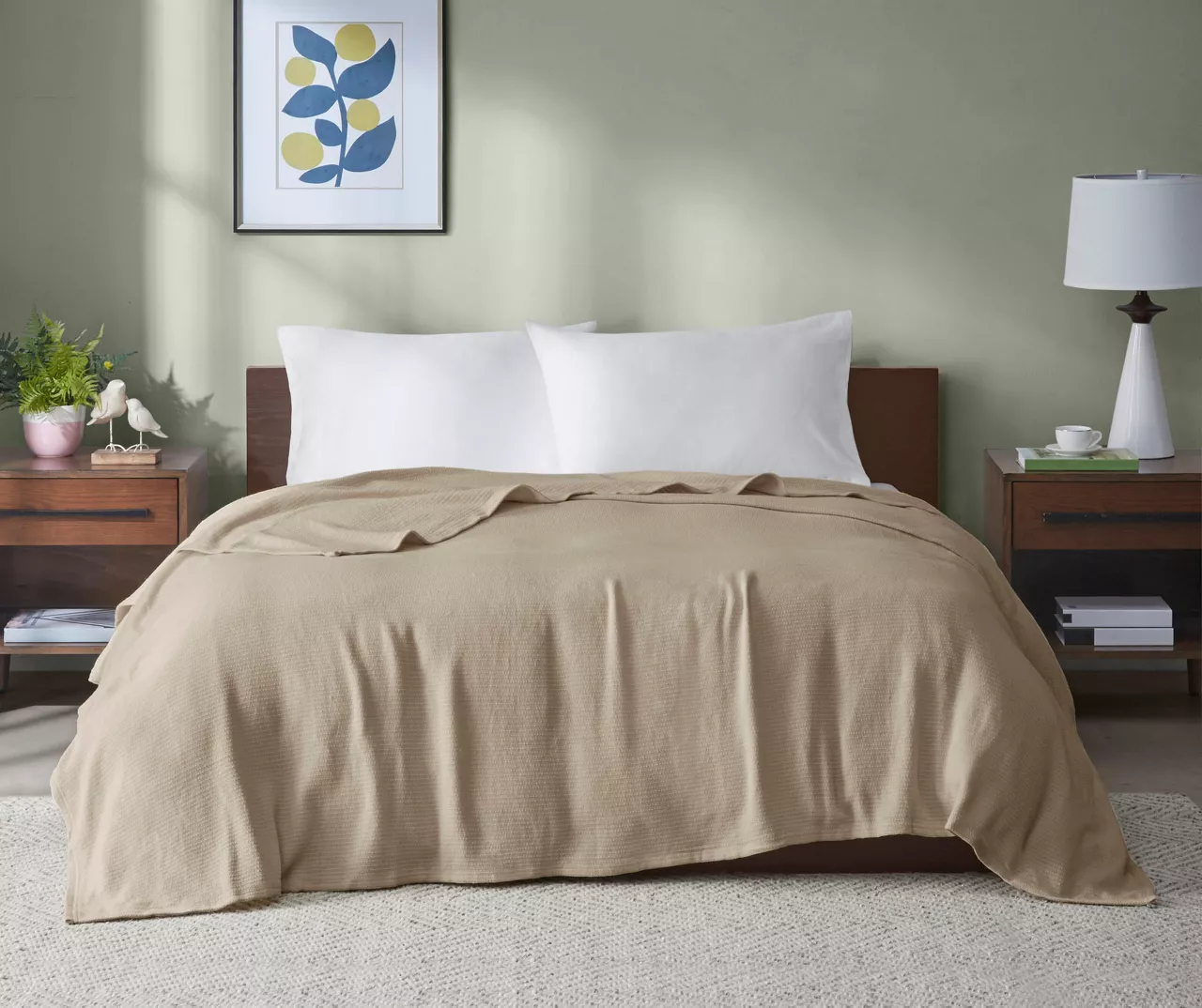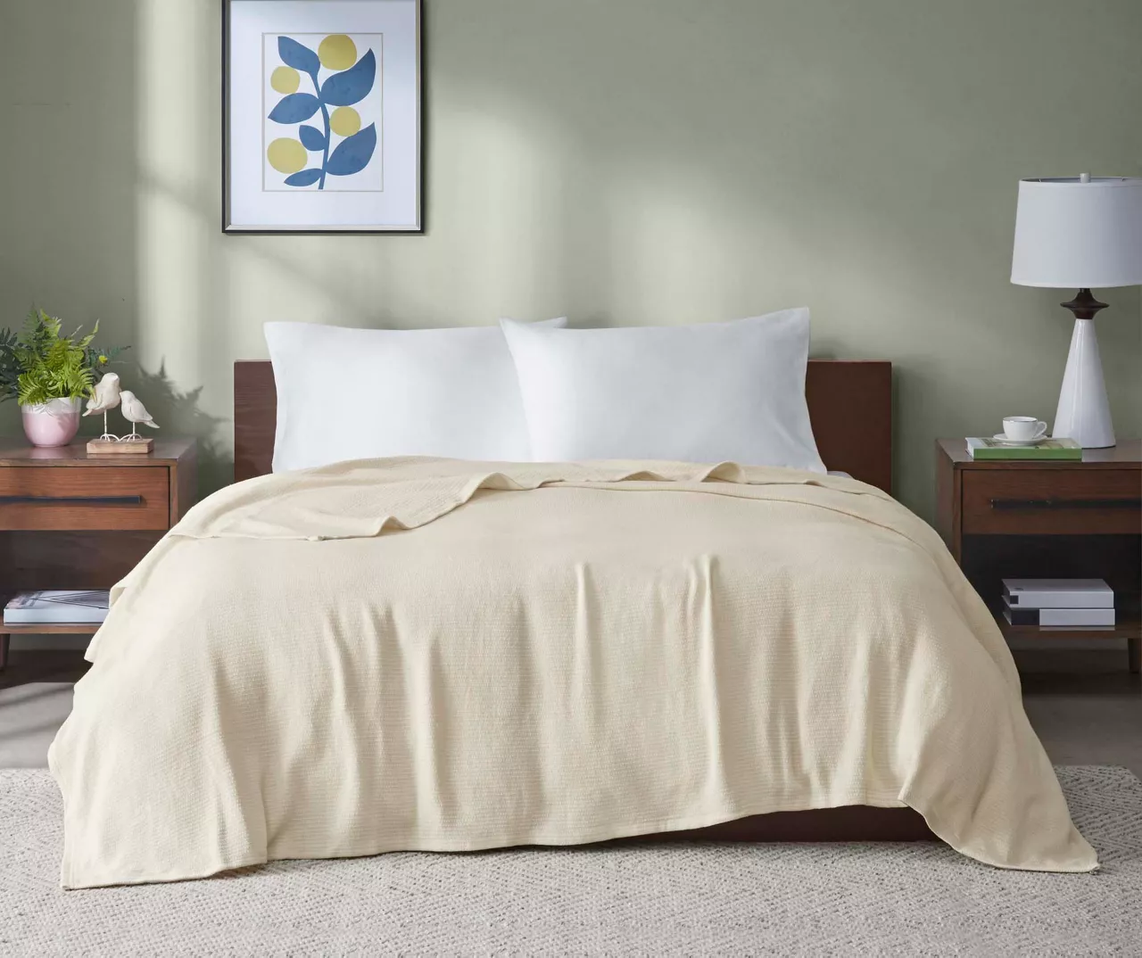 The Freshspun blanket features a charming basketweave textured pattern made from high-quality upland cotton for breathable and cozy coverage that’s perfect for year-round use. It can be used alone on warm nights or layered with other bedding for extra cozy coverage. The solid blue shade is easy to pair with your existing bedroom arrangements whether you opt to use this in a kids’ or master bedroom.