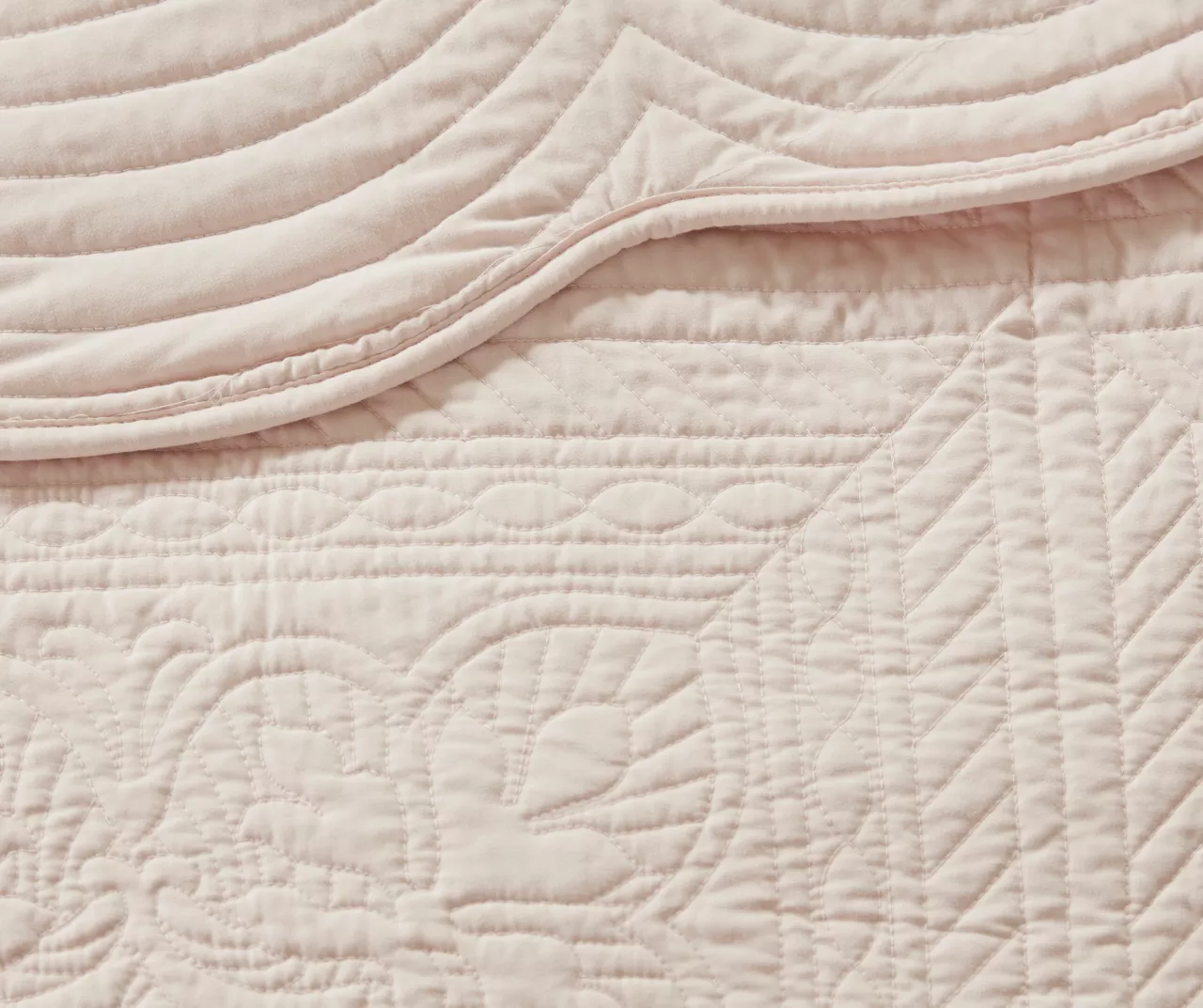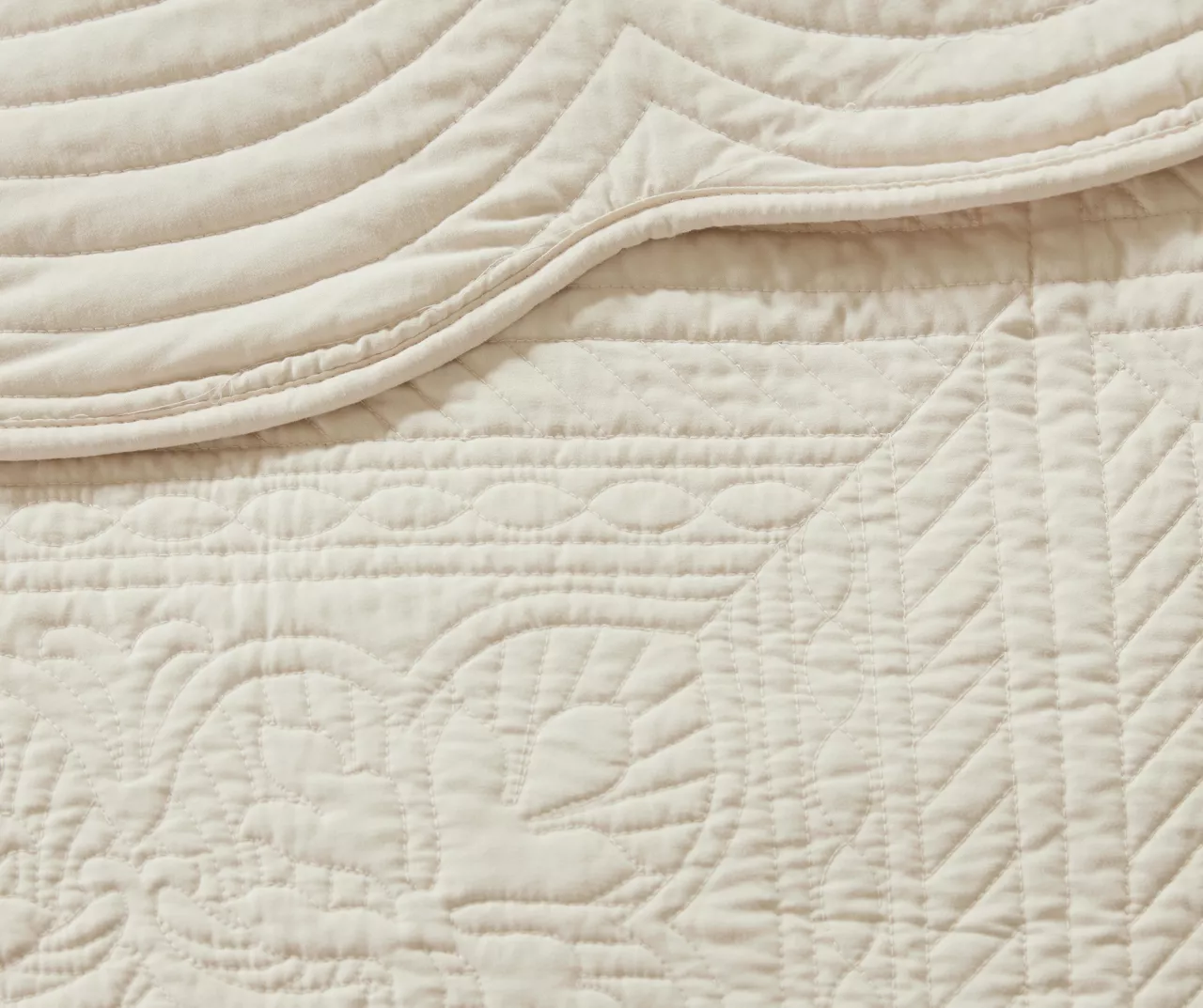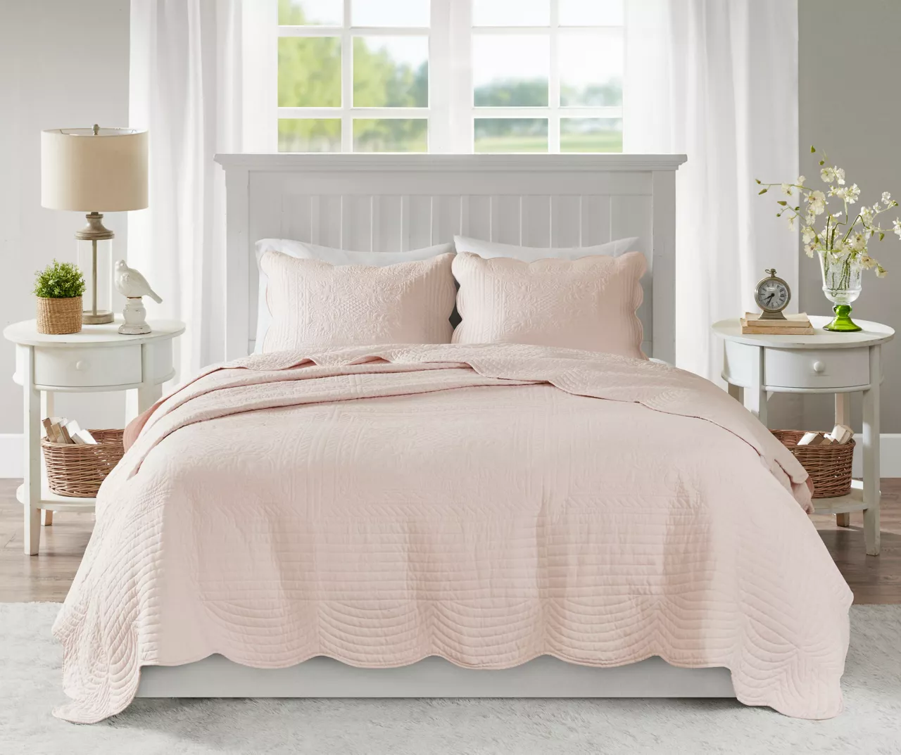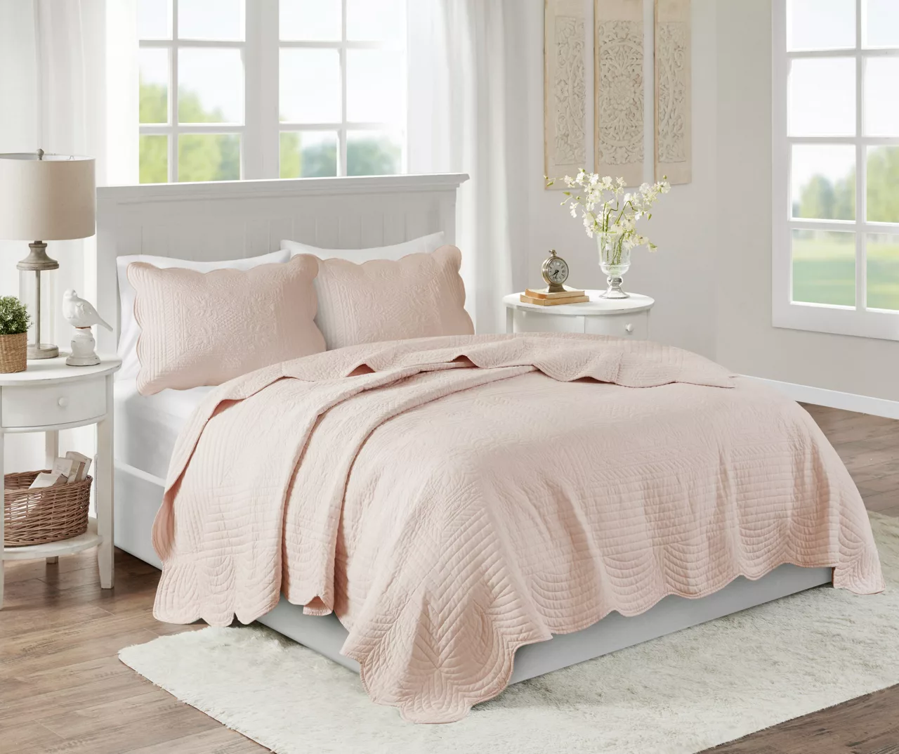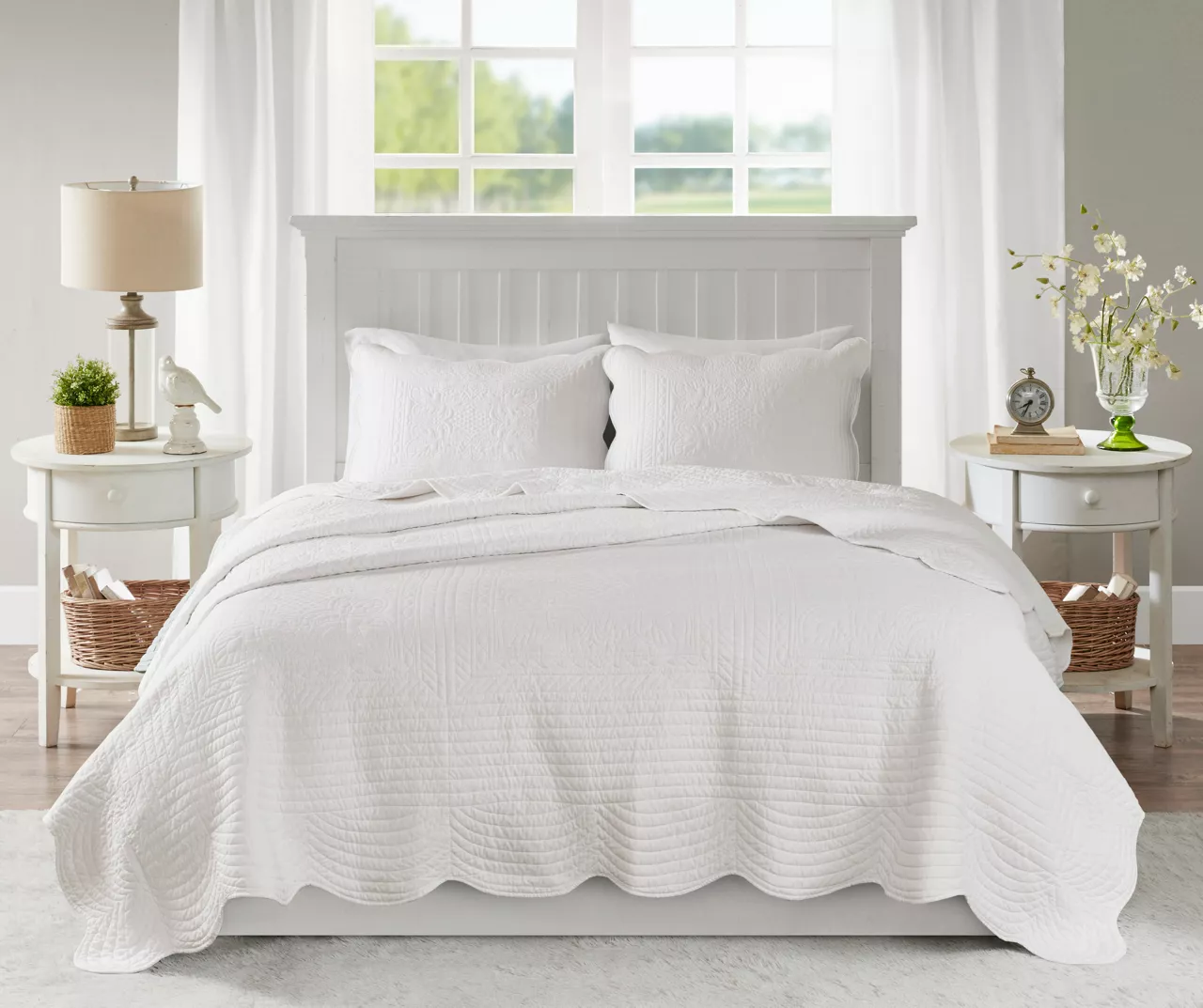 - Cottage/country style quilted reversible coverlet set in scallop edge