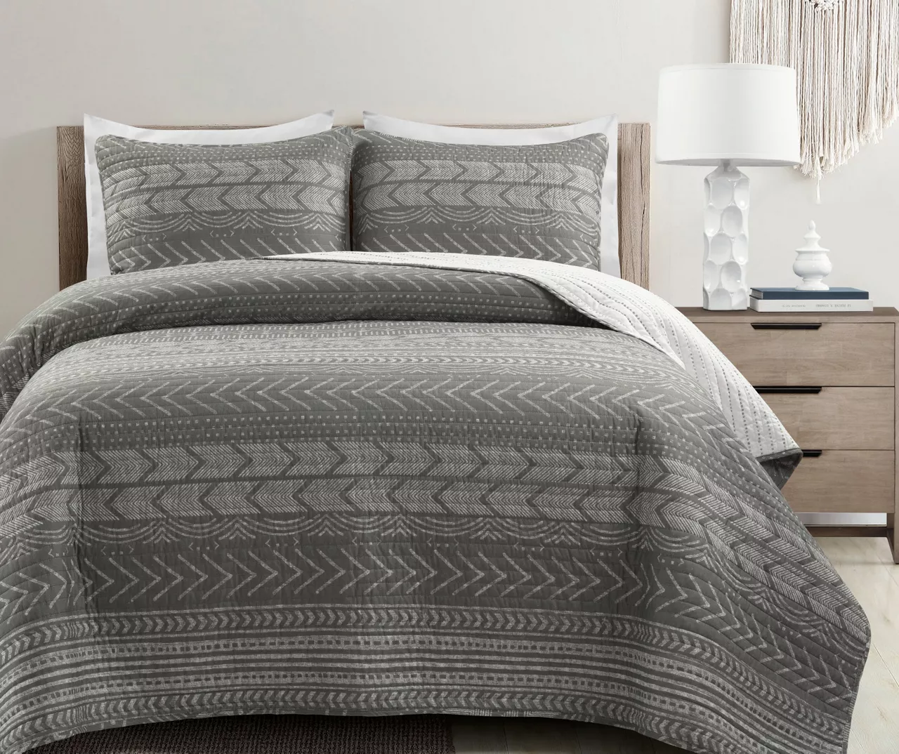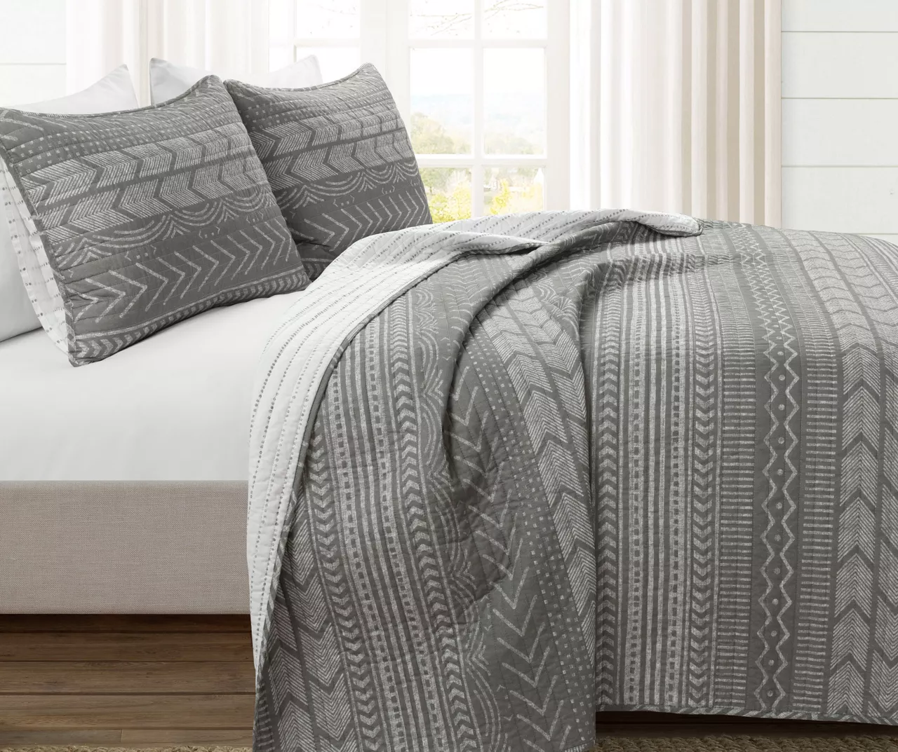 Style your sleep space with the free-spirited vibes and Scandanavian inspiration of this cozy quilt set from Lush Decor featuring rows of geometric designs in white and charcoal hues. Matching shams complete the look for a quick and simple bedroom makeover.