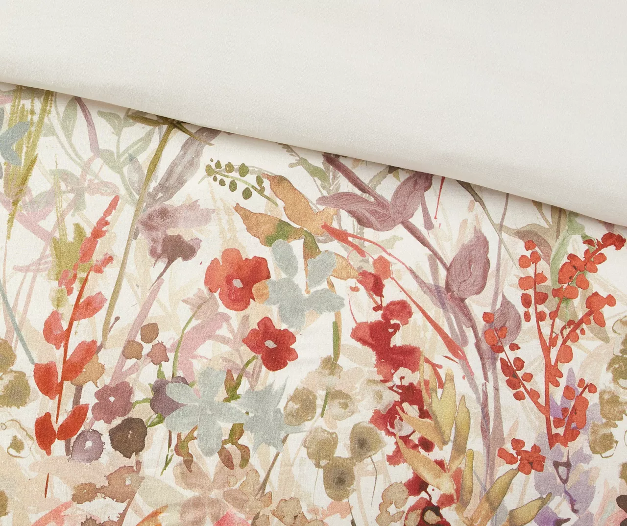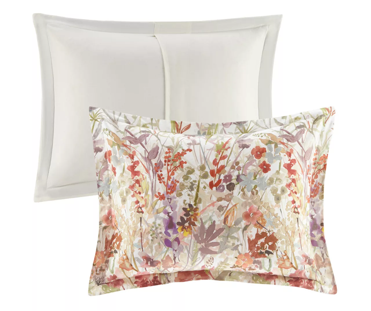 This Julia comforter set brings a touch of beauty to your bedroom decor. This cotton comforter features a watercolor floral print that runs from the middle of the bed to the foot, for a beautiful transitional look. Two coordinating shams pair perfectly with the comforter, while three decorative pillows with embroidery and tufted details provide rich textural accents to the bed. A solid bed skirt adds the finishing touch to complete the comforter set.