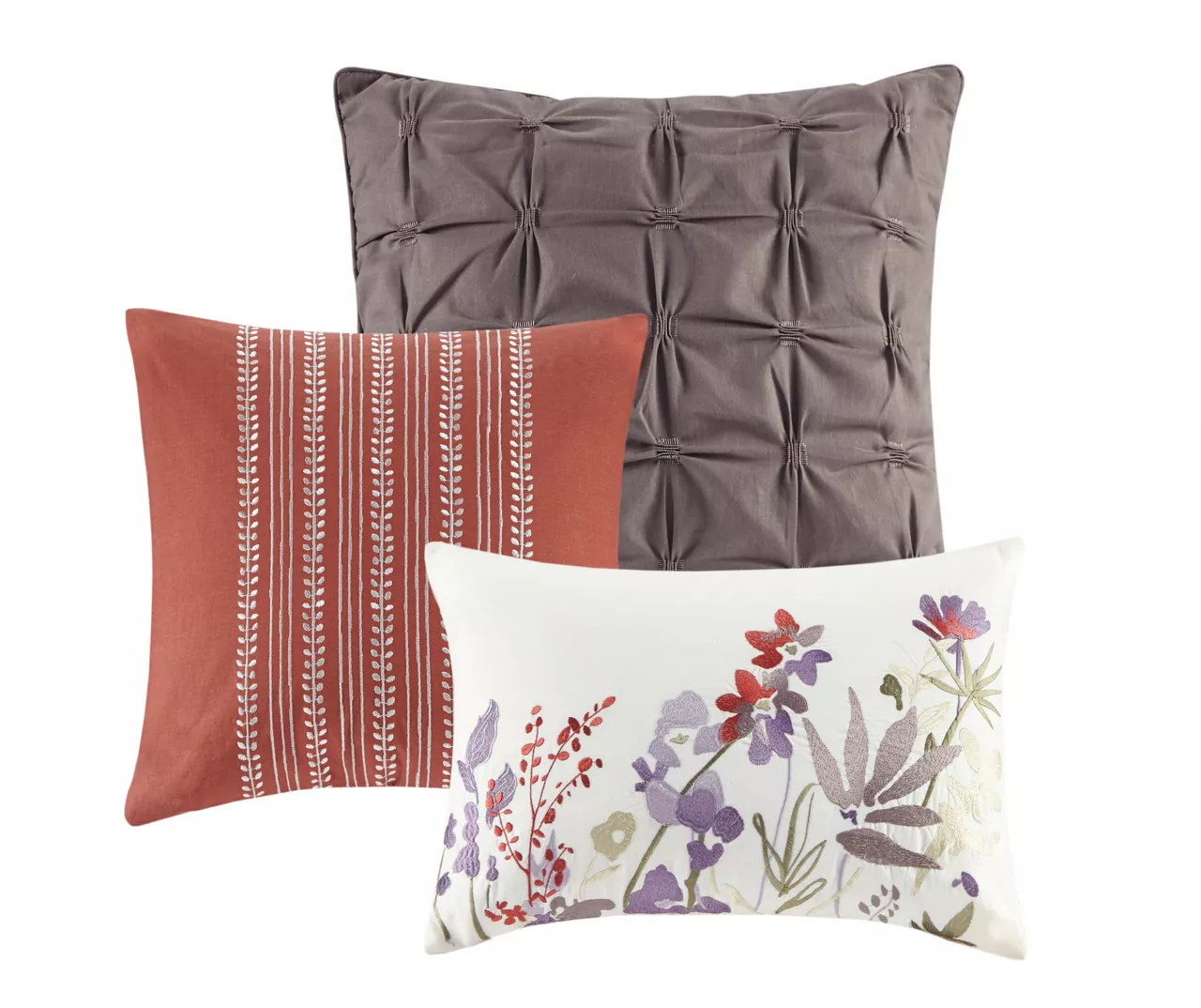 - Includes comforter, bed skirt, 2 shams and 3 decorative pillows