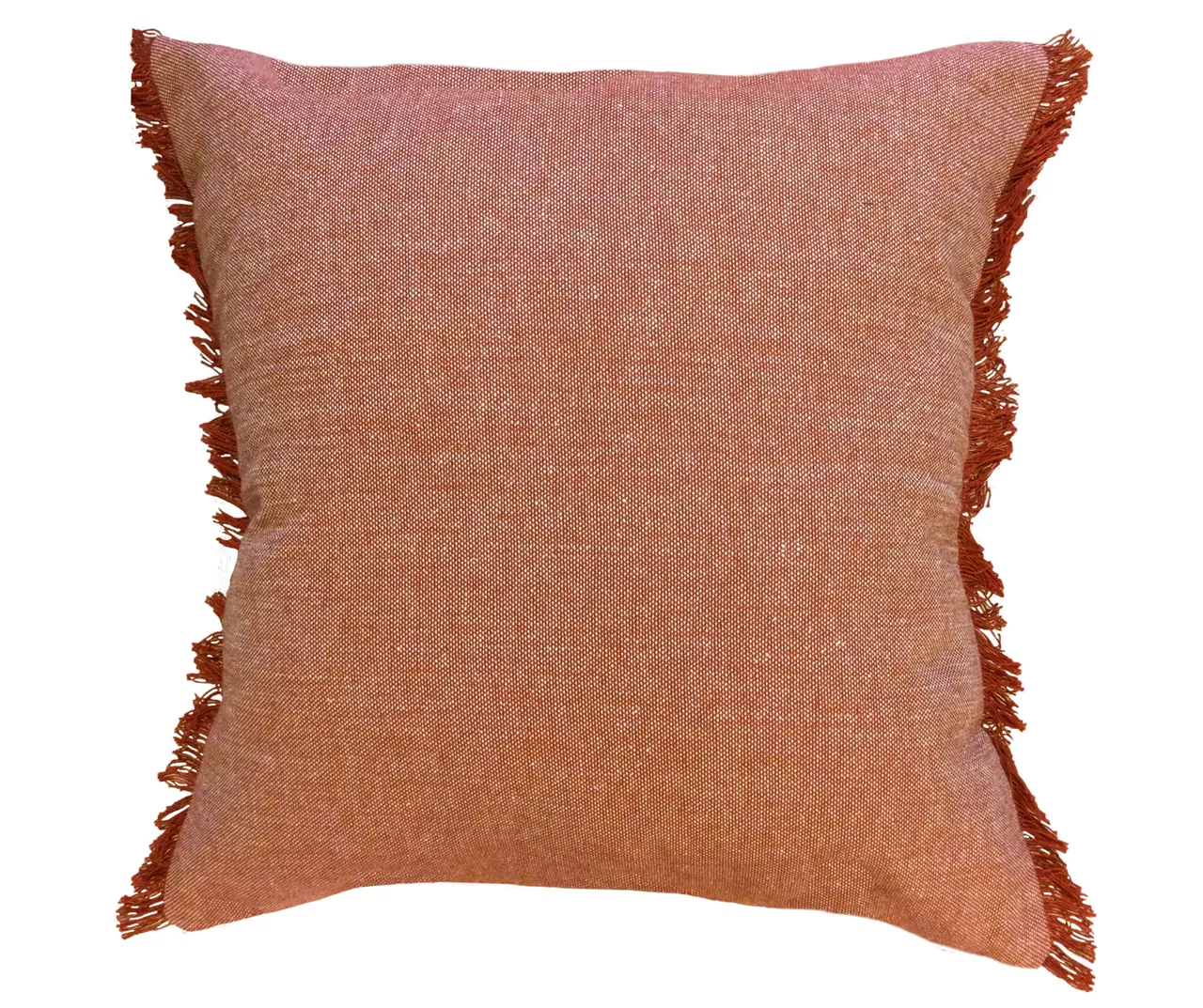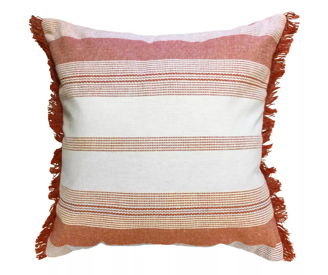 Deck your home with the classic elegance of this throw pillow styled with variegated stripes in deep coral and white hues. Fringe detailing on the sides creates an eclectic boho look and the woven cotton fabric lends soft comfort to any room this pillow is placed.