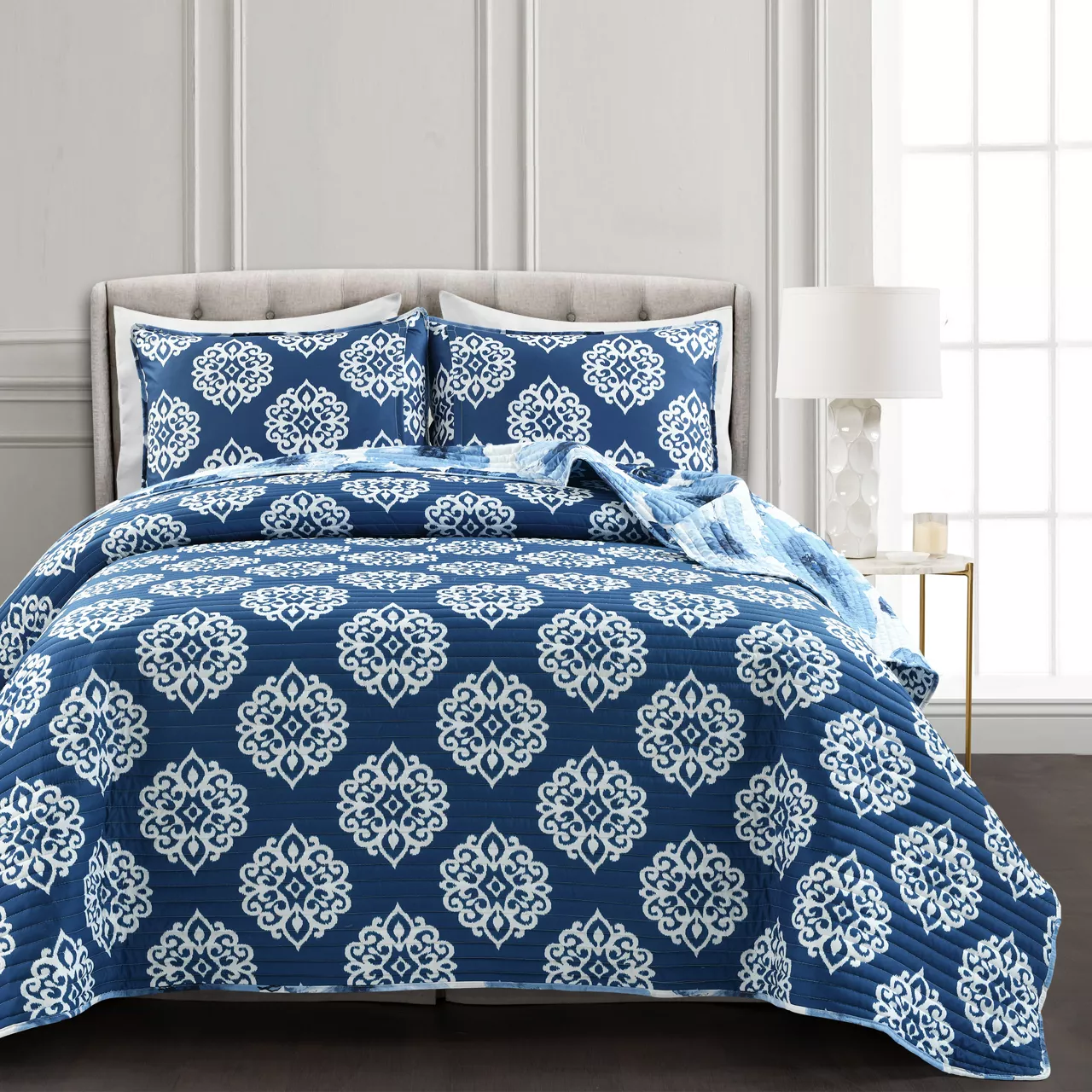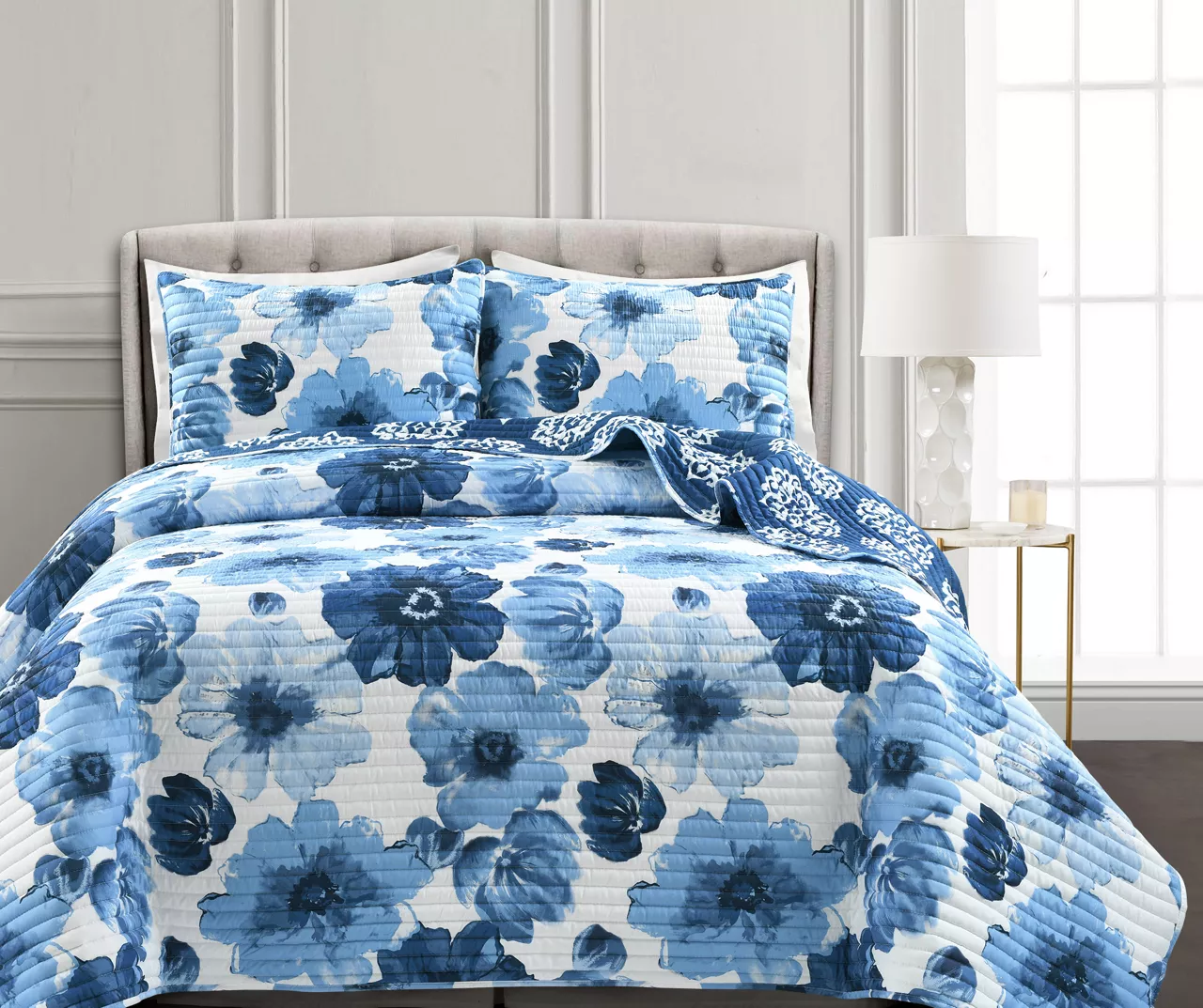 Refresh your sleep space with some botanical beauty when you add this cozy quilt set featuring a watercolor floral print in soothing navy and blue hues on a white background. The reverse side of the quilt is defined by a damask print for an elegant finishing accent.