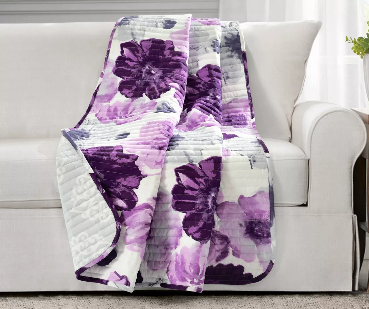 Refresh your living space with the botanical beauty of this cozy throw featuring a watercolor floral print in soothing purple hues on a white background. The reverse side features a damask print for an elegant finishing flourish.