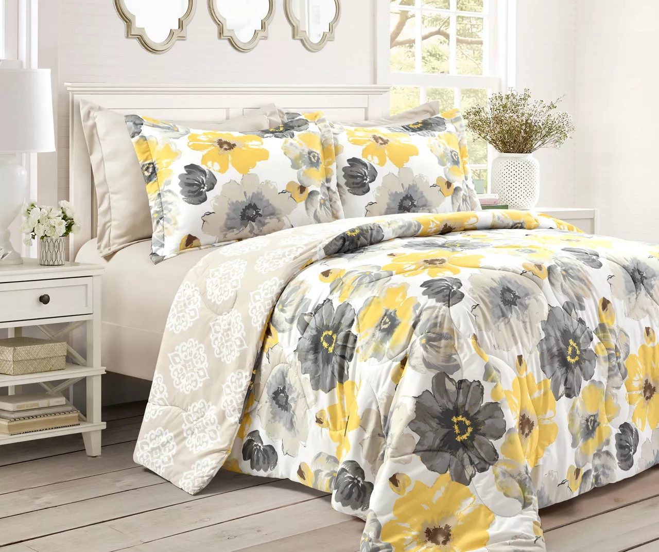 Bring the beauty of a botanical garden into your sleep space with the yellow and gray floral print of this cozy comforter set featuring arabesque quilting on the front and a soft damask pattern in beige and white on the back. Complementary shams complete the look with chic, contemporary flair.