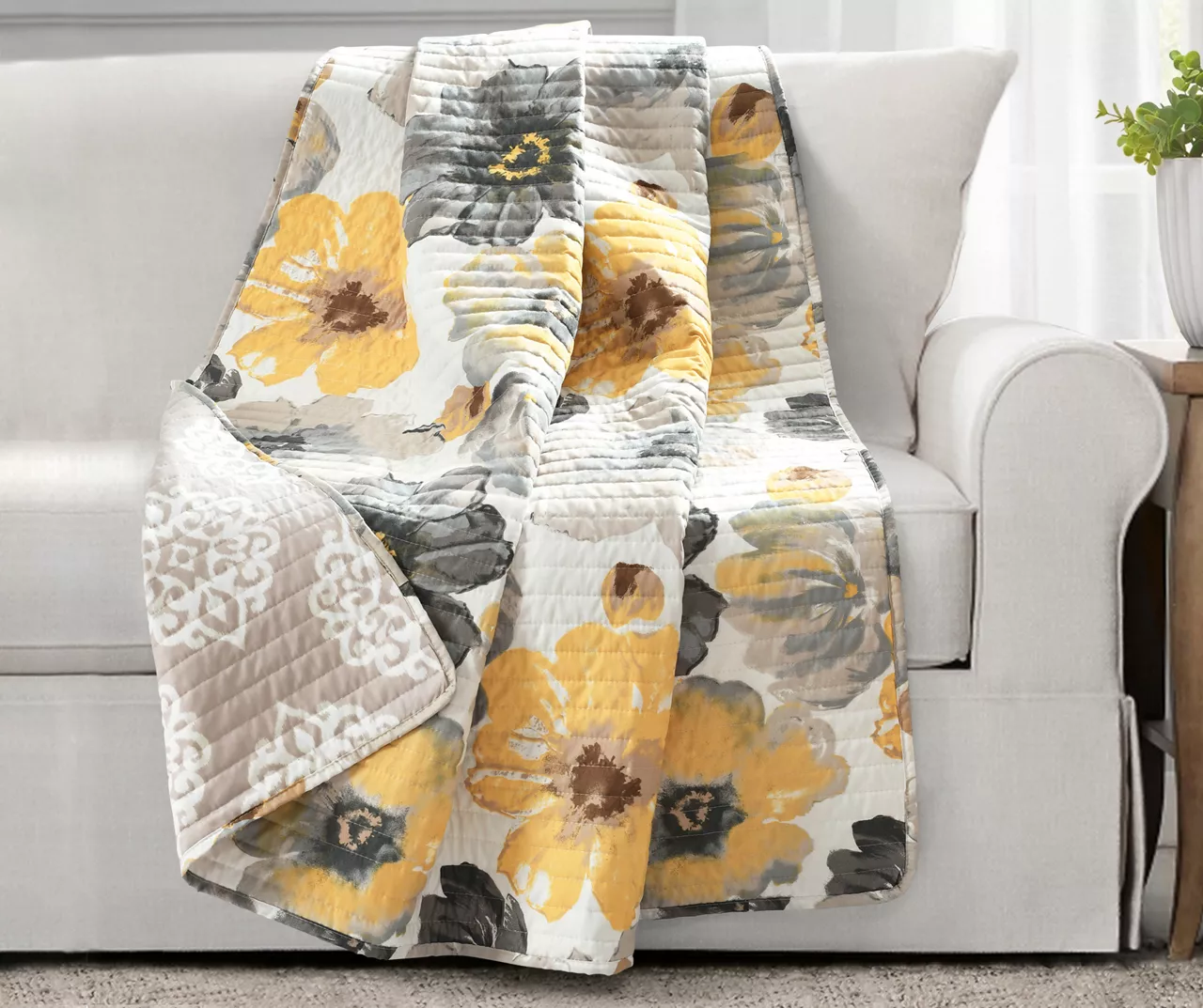 Refresh your living space with the botanical beauty of this cozy throw featuring a watercolor floral print in soothing gray and purple hues on a white background. The reverse side features a damask print for an elegant finishing flourish.