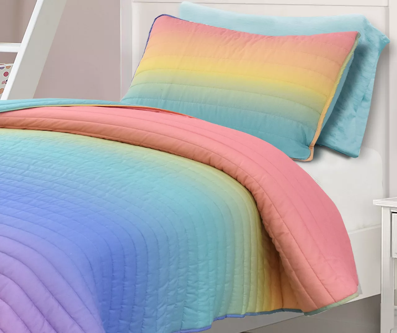 Bring a whole new level of excitement to your kid’s room or a guest room through the vivid rainbow shades of this quilt set from Lush Decor. The trendy ombre design is complemented by matching shams and soft polyester fabric provides cozy warmth through the night.