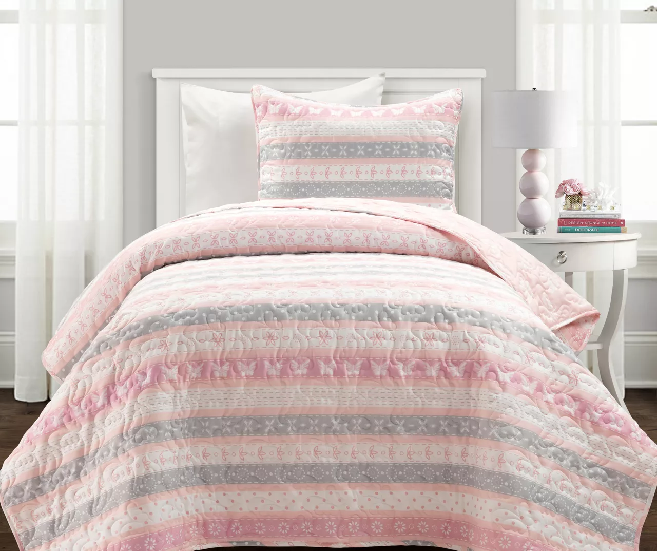 Butterflies and flowers are a perfect recipe for a delightful kid’s bedroom design, and this quilt set from Lush Decor is sure to deliver the charm. This reversible set showcases two whimsical designs to choose from including a patterned stripe design and pink and white butterflies. Matching shams complete the look and the soft polyester fabric lends cozy comfort through the night.