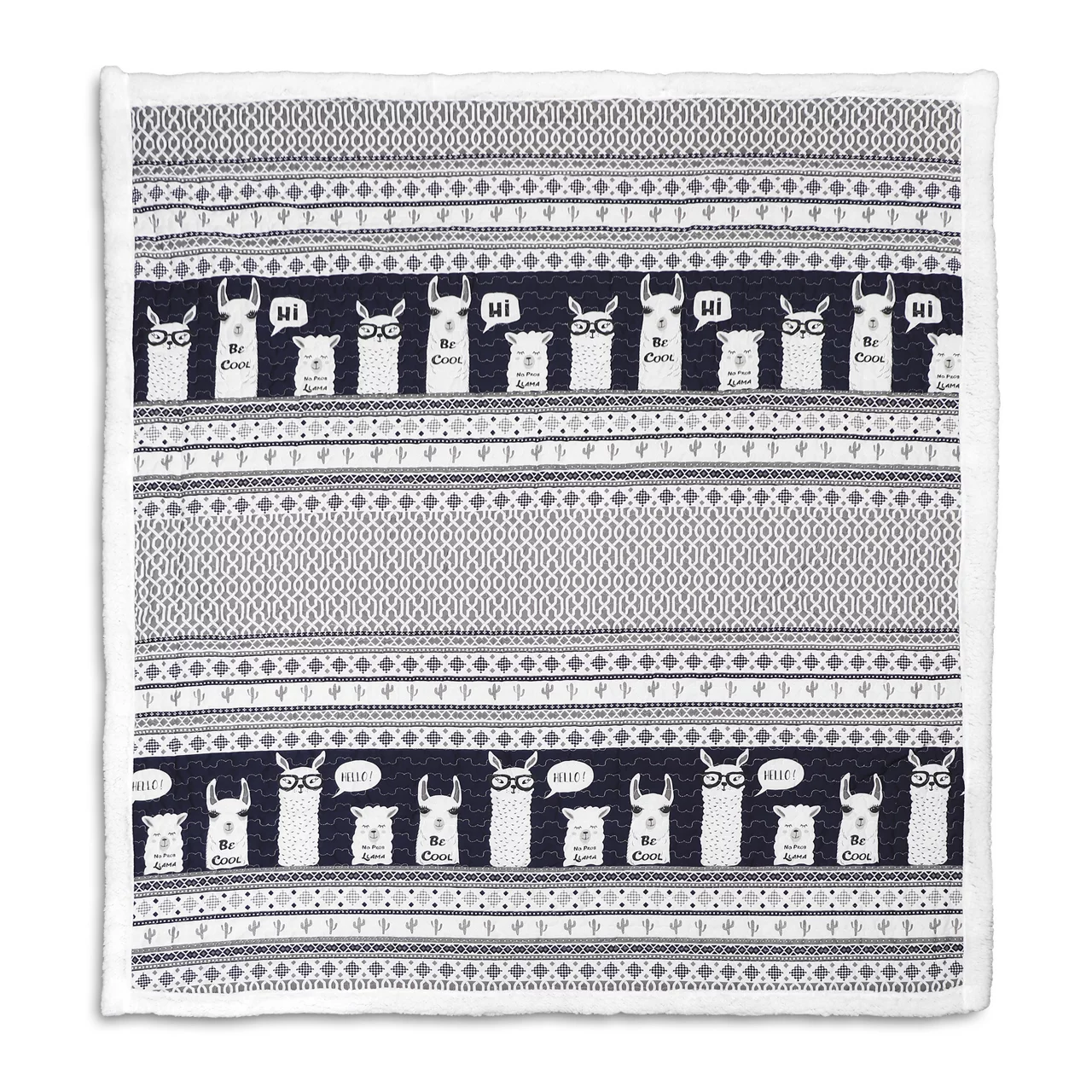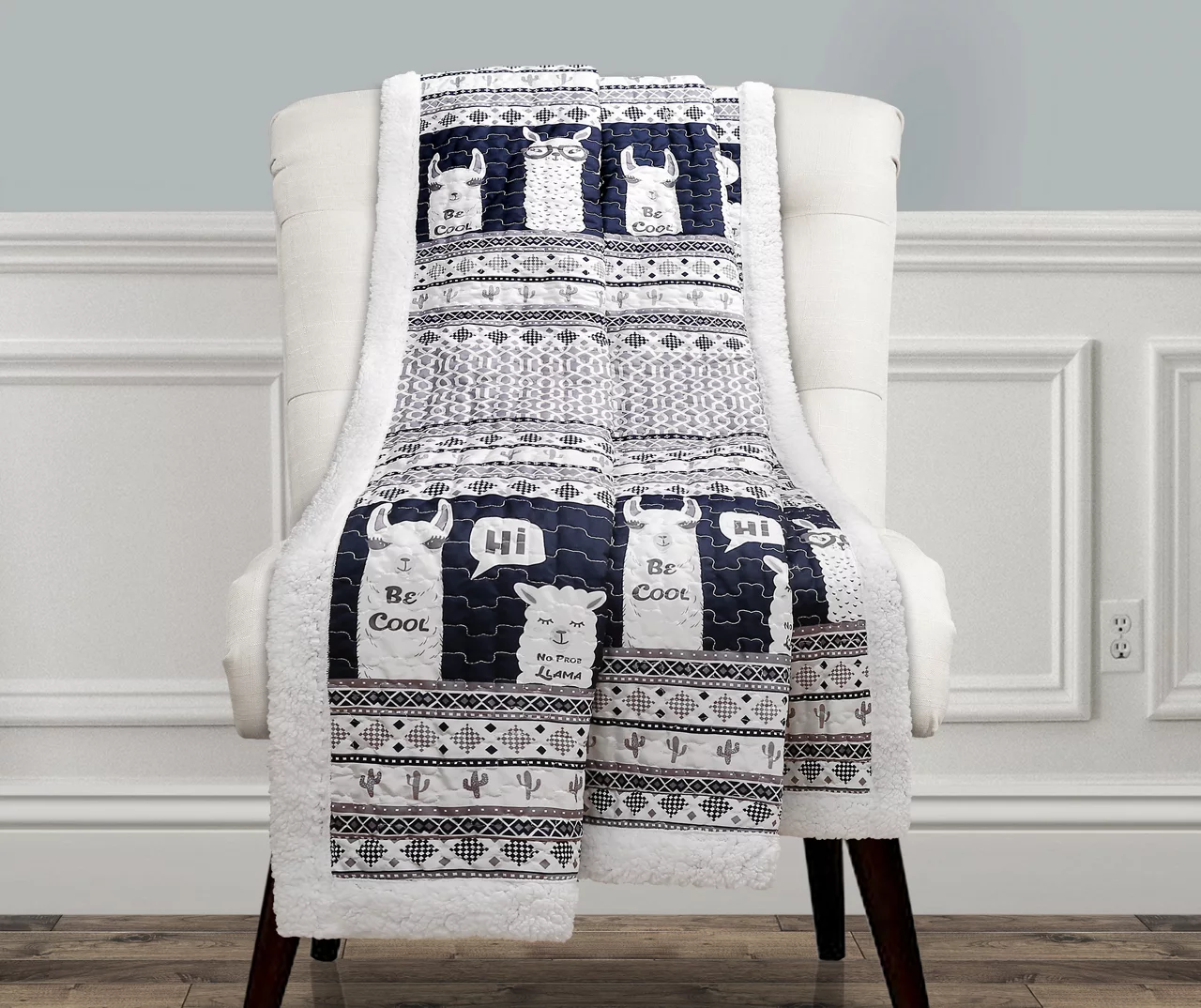 Introduce some lively llama charm into your living space or bedroom with the soft gray and pastel design of this quilted throw, complete with cozy sherpa fabric on the trim and reverse side that delivers warm comfort.