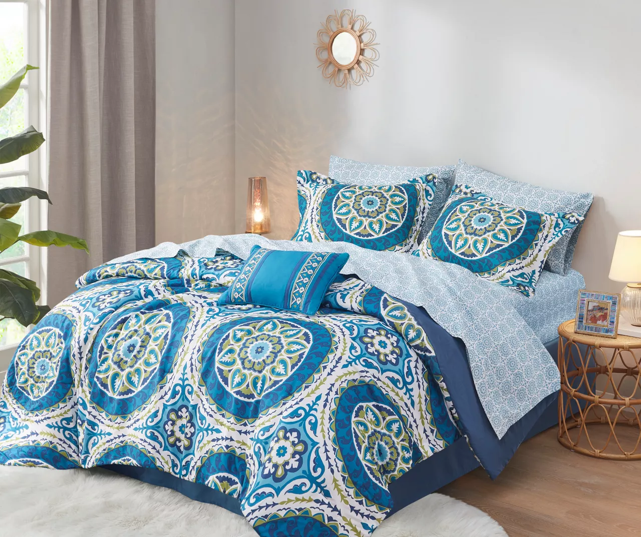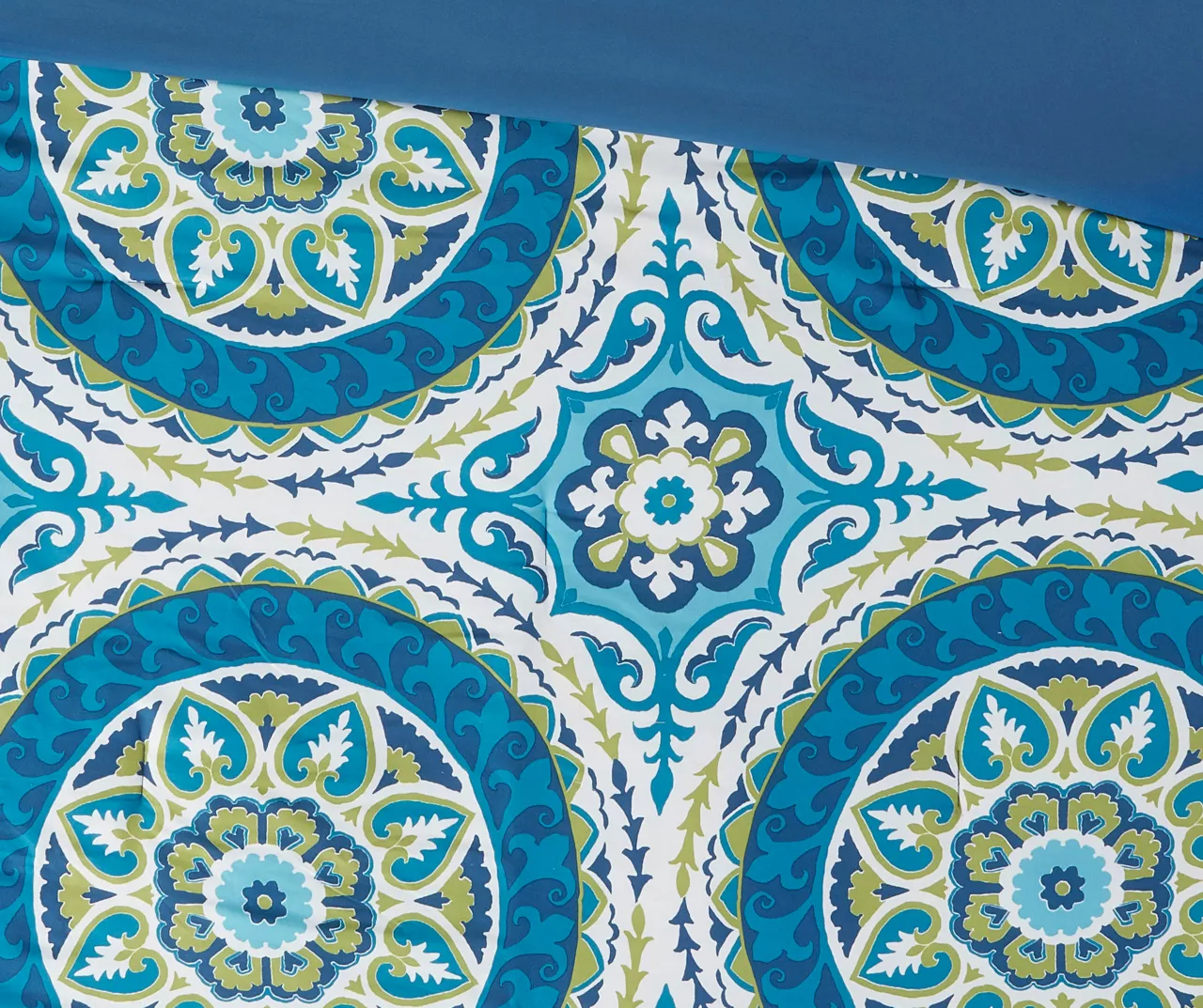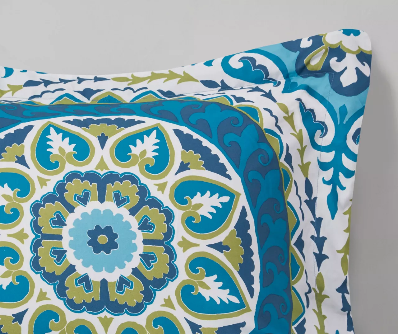 The Nepal bedding set provides a fresh globally inspired look for your bedroom with its intricate medallion pattern that repeats across the front in brilliant shades of blue, green and white. An oblong pillow flaunts decorative embroidery and striping to create textured charm, and a gray cotton sheet set features a coordinating medallion print to complete the look. This bedding set also features an antimicrobial* treatment that provides built-in freshness protection, reducing the growth of odor-causing bacteria and keeps fabric lasting longer.