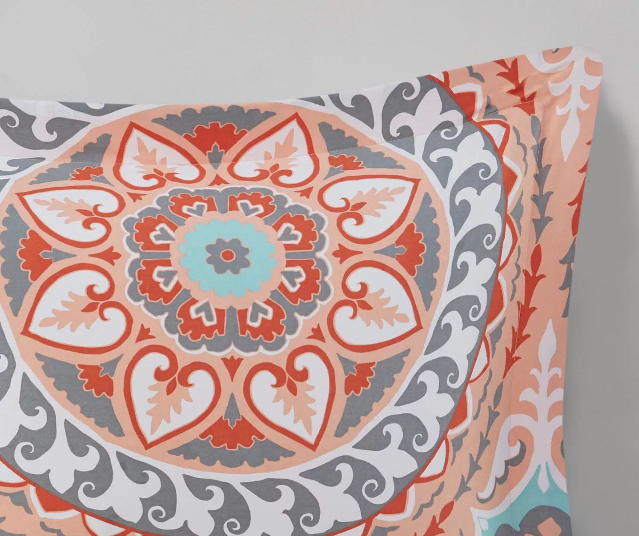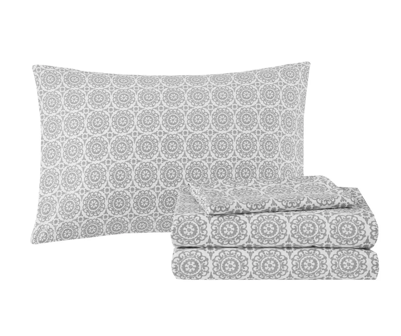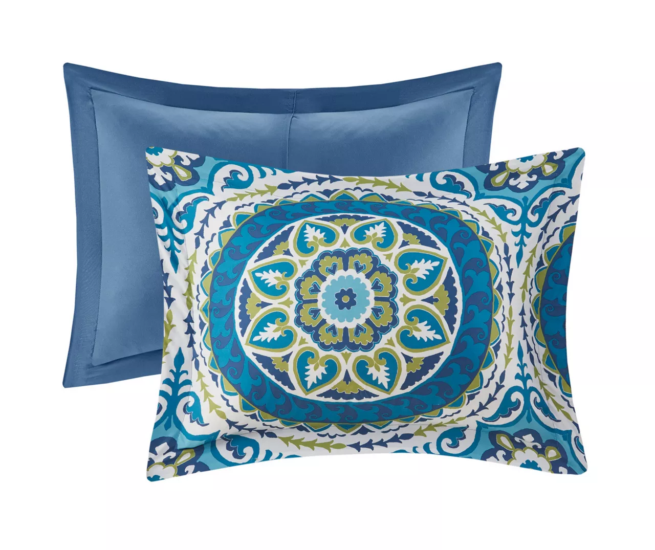 The Nepal bedding set provides a fresh globally inspired look for your bedroom with its intricate medallion pattern that repeats across the front in brilliant shades of blue, green and white. An oblong pillow flaunts decorative embroidery and striping to create textured charm, and a gray cotton sheet set features a coordinating medallion print to complete the look. This bedding set also features an antimicrobial* treatment that provides built-in freshness protection, reducing the growth of odor-causing bacteria and keeps fabric lasting longer.