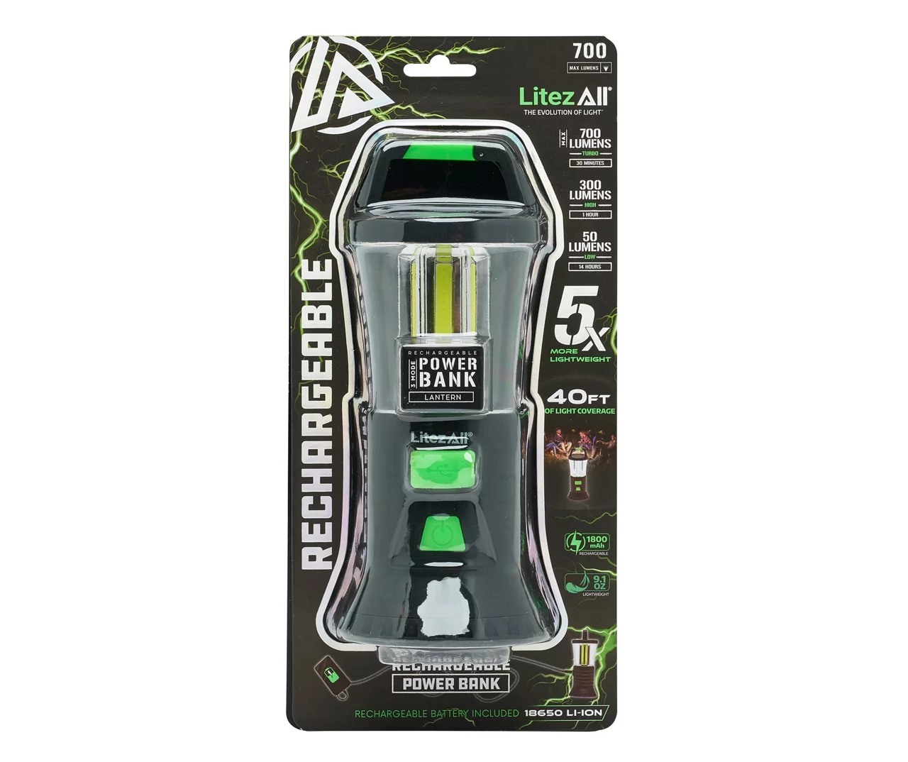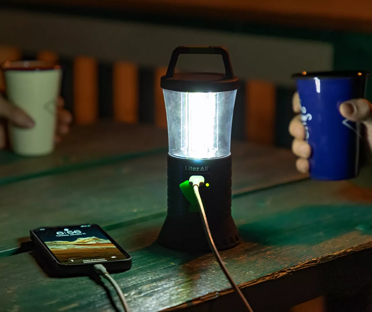 Extremely bright, durable and light weight, this 700 lumen rechargeable lantern from Litezall offer impressive versatility whenever you need extra illumination. At only 8″ high, it packs easily and is a great camping lantern. The top mounted carabiner allows for convenient hanging on backpacks or tent loops. The lantern is rechargeable from any USB power source and the cable stores conveniently in the base of the lantern. This sleek portable lantern is powered by an 1800mAh lithium-ion battery which also functions as a power bank to charge your smartphone on the go.