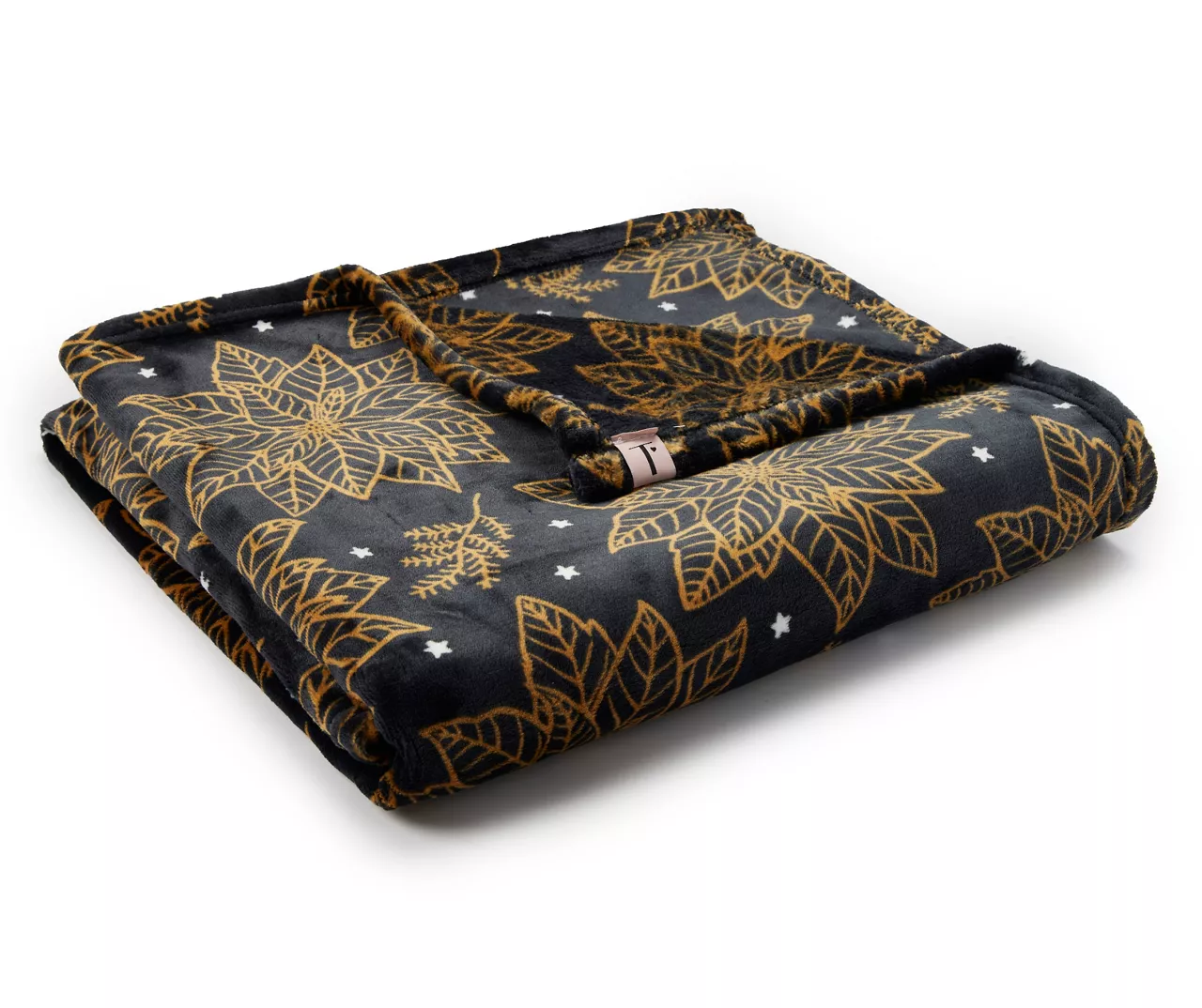 Stay warm and comfy whether it’s film night or you’re diving into a new book with this soft and cozy Thalia throw. The plush material is printed with a festive poinsettia pattern in gold on black for a merry accent in a bedroom or living room.