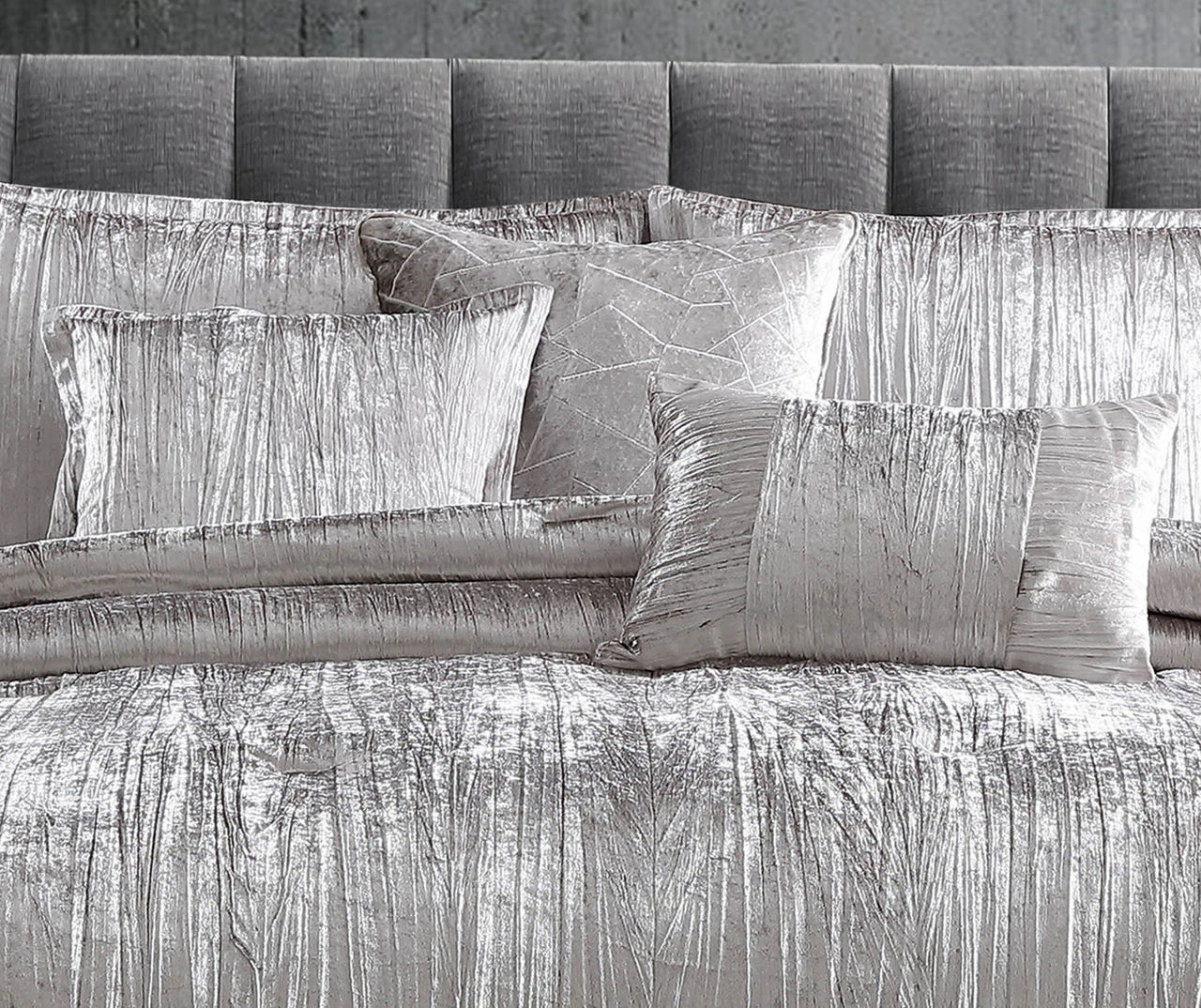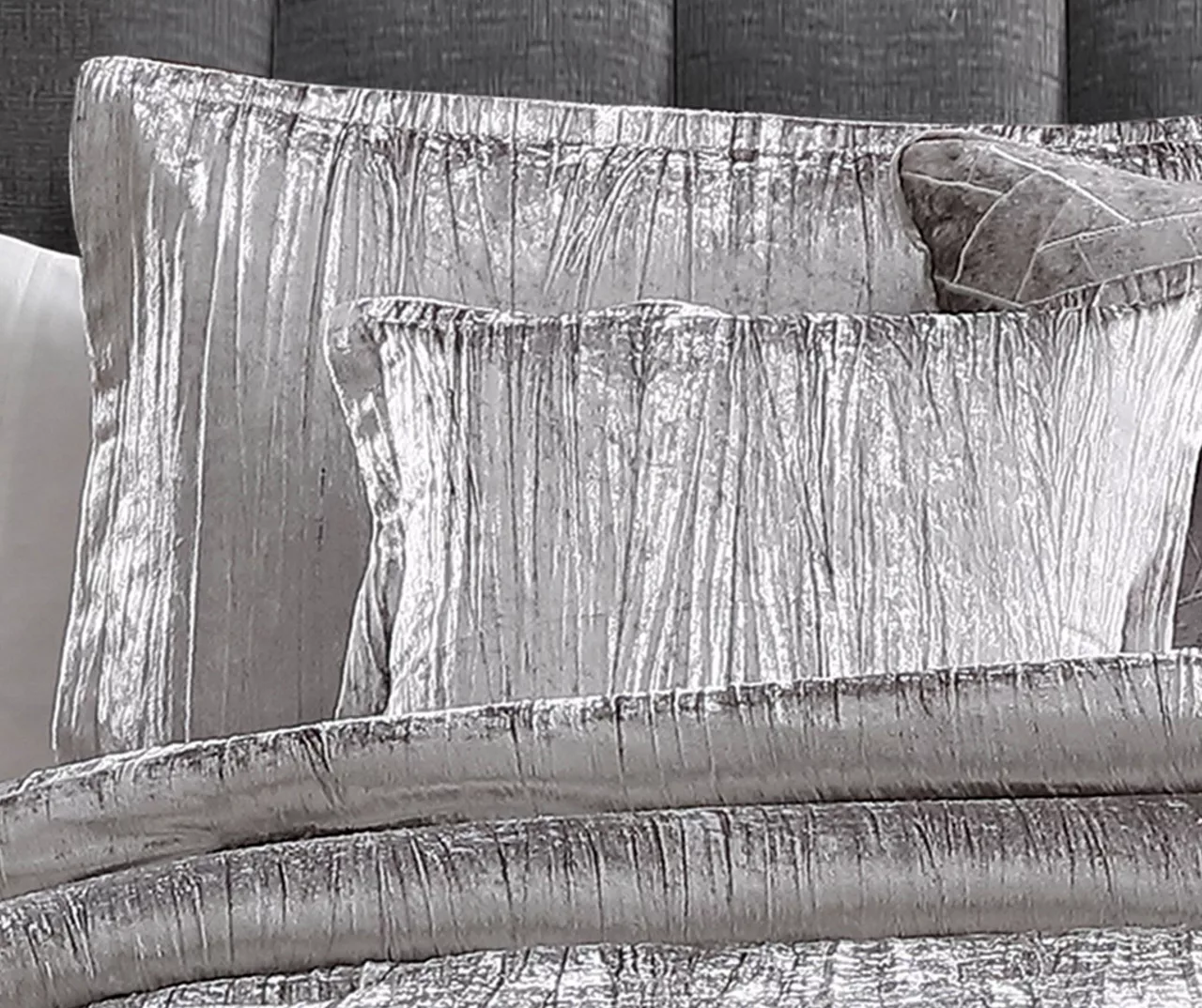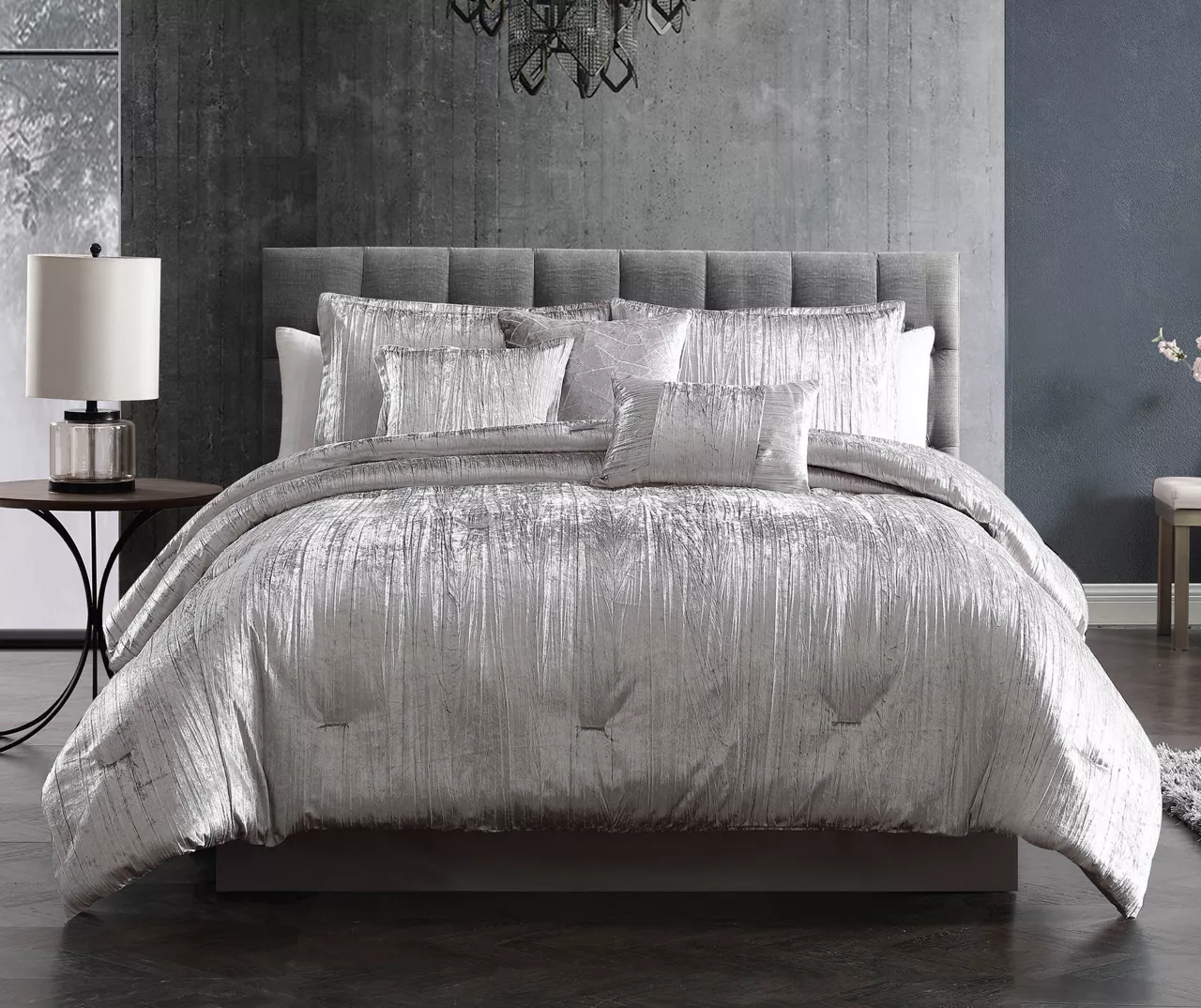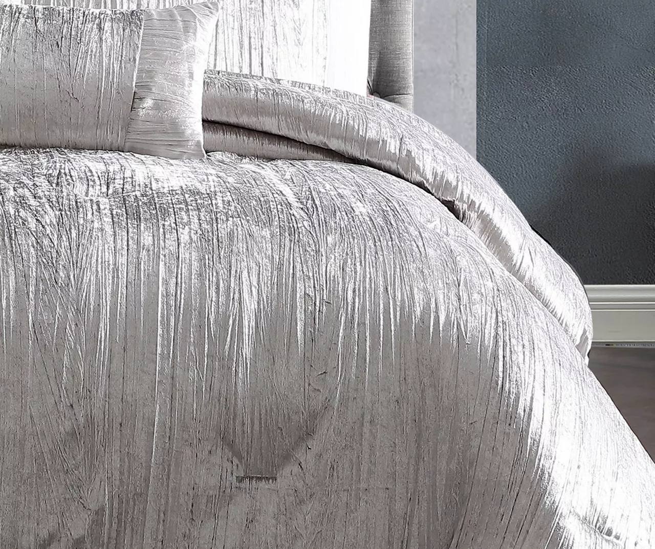 Give your bed a little glow-up with the shimmering sophistication of this lush velvet comforter set flaunting a crinkled effect for added dimension and modern style. Subtle textured and tonal patterns and designs bring contemporary-chic definition to the decorative pillows. A matching bedskirt completes the look.