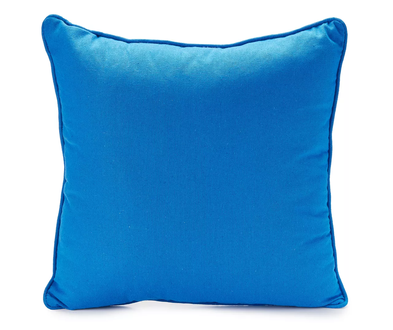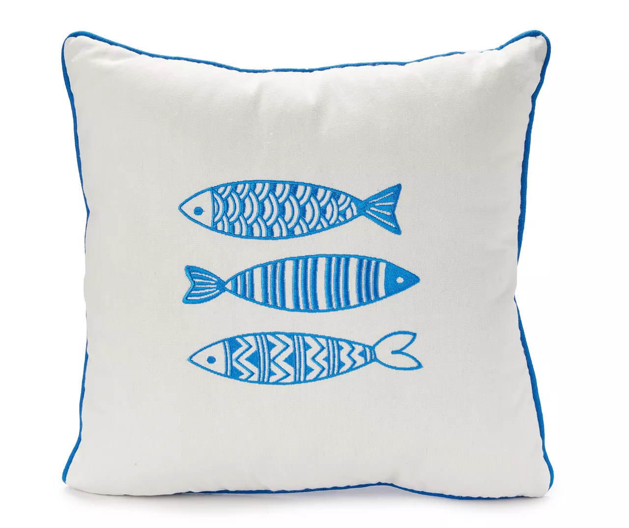 With an embroidered fish design, bright blue piped trim and a blue reverse side, this plush throw pillow from Lush Décor brings coastal charm to any bed, sofa or accent chair it graces.