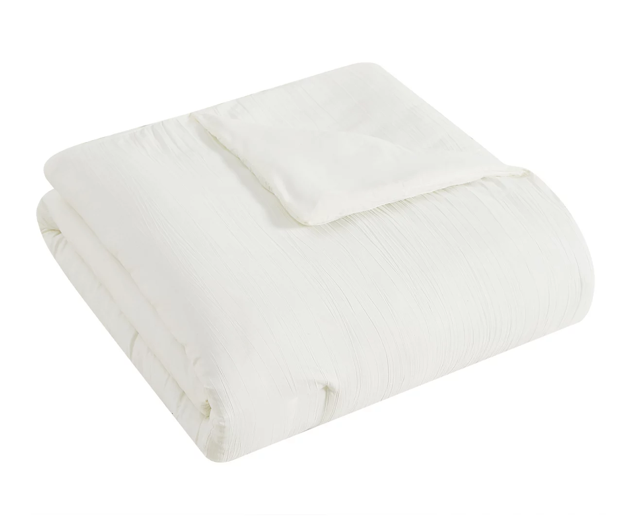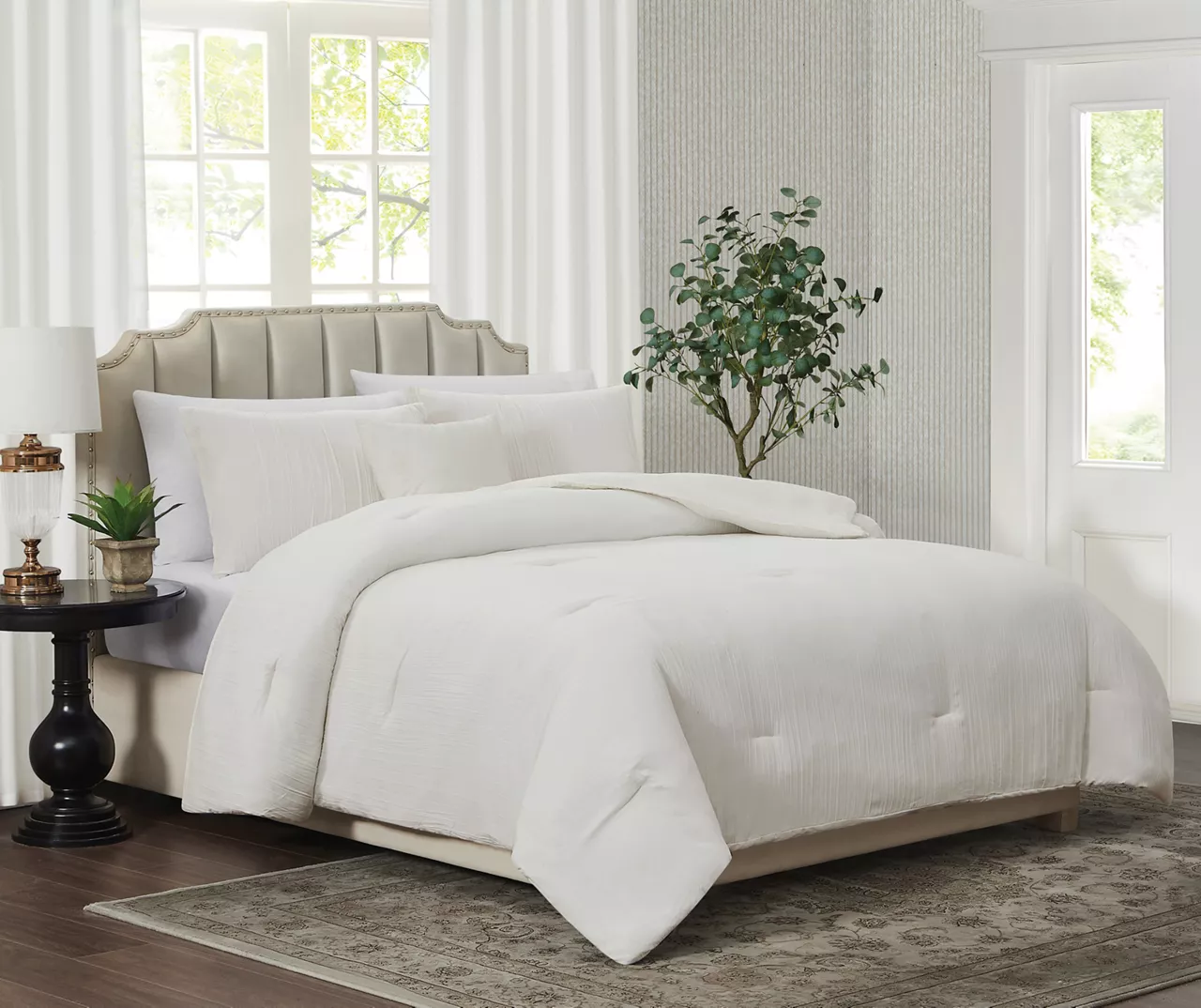Finished with a subtle crinkle texture, this comforter set updates your sleep space with understated contemporary style. The fabric boasts a solid color that’s easy to coordinate with surrounding decor, and it’s supersoft to the touch for cozy comfort through the night.