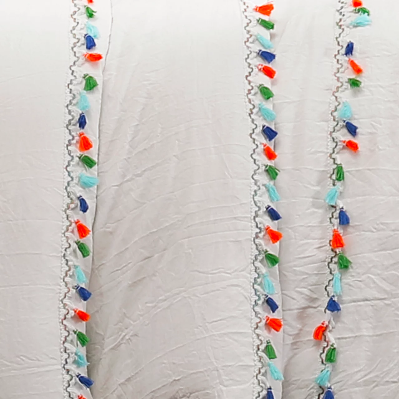 Beautify the bedroom with boho vibes when you add this plush and cozy bedding set featuring crinkled white fabric adorned with rows of bright, multicolored tassels for playful style that stands out.