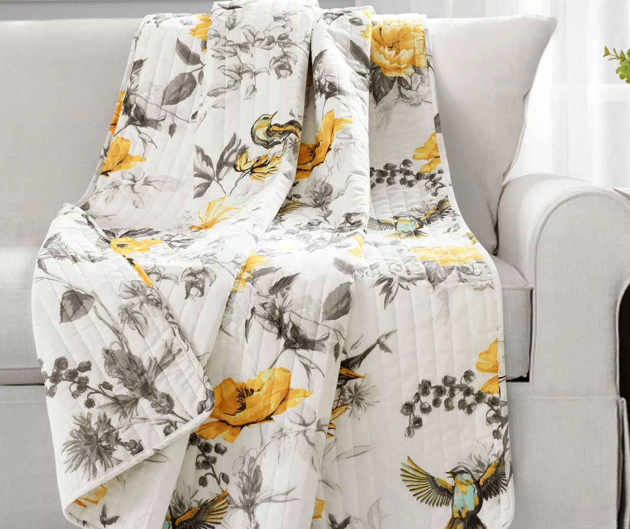 A tradtional floral print in rich yellow and soft gray hues brings timeless elegance to this cozy throw crafted from quilted, breathable cotton fabric for warm comfort on cool days and nights.
