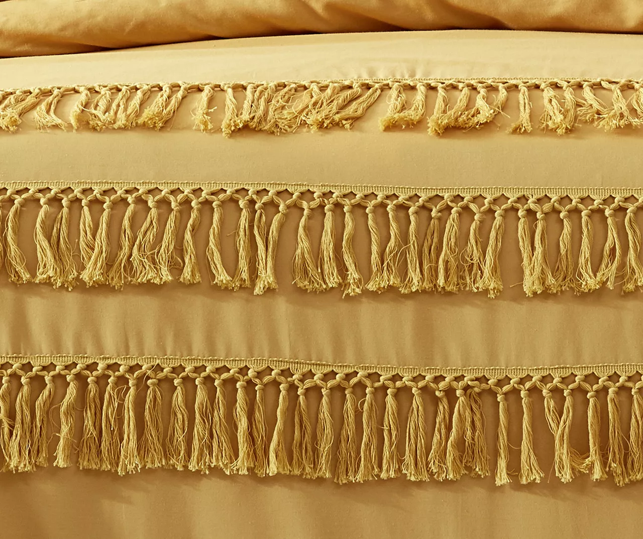 Rows of macrame tassels bring playful movement and boho flair to this cozy and soft comforter set in a bright marigold yellow color. It’s a modern way to brighten any guest or master bedroom, and the breathable cotton keeps you comfy through the night.